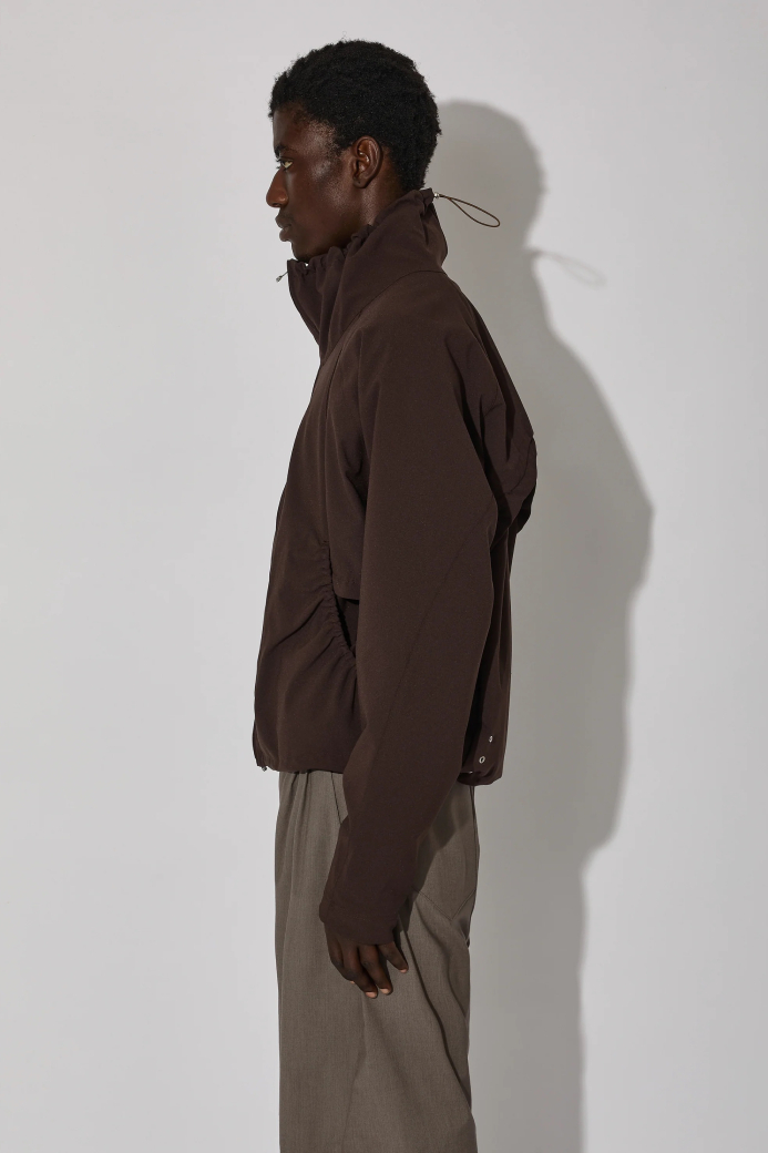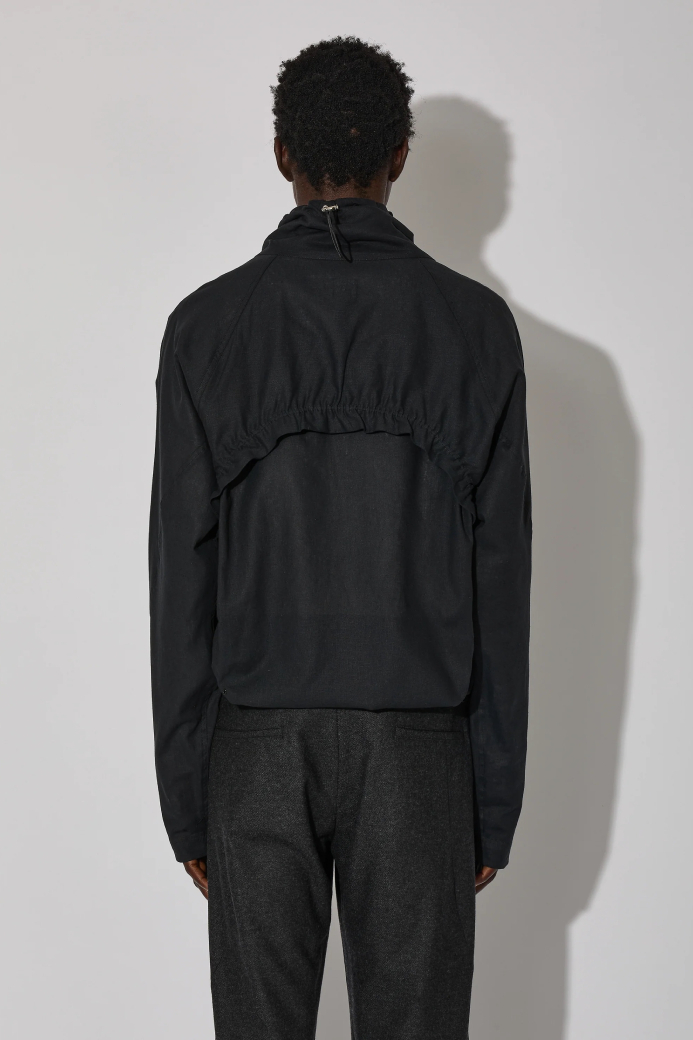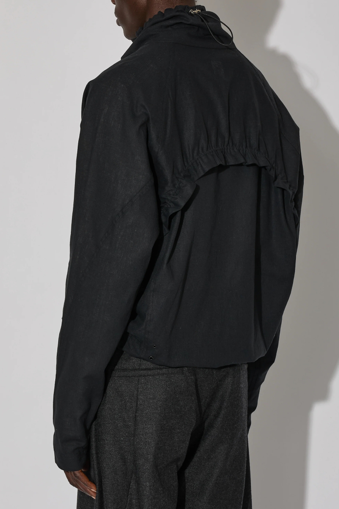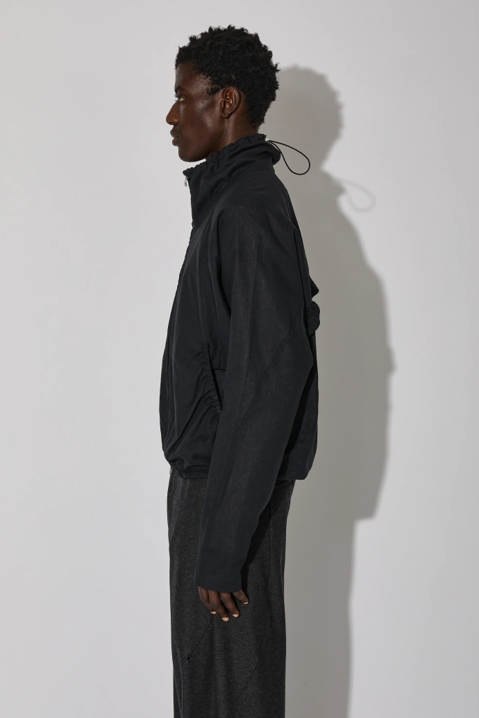 ・選用輕盈的亞麻布料,打造短版且線條流暢的立體設計,搭配收束式領口與抽繩調節扣