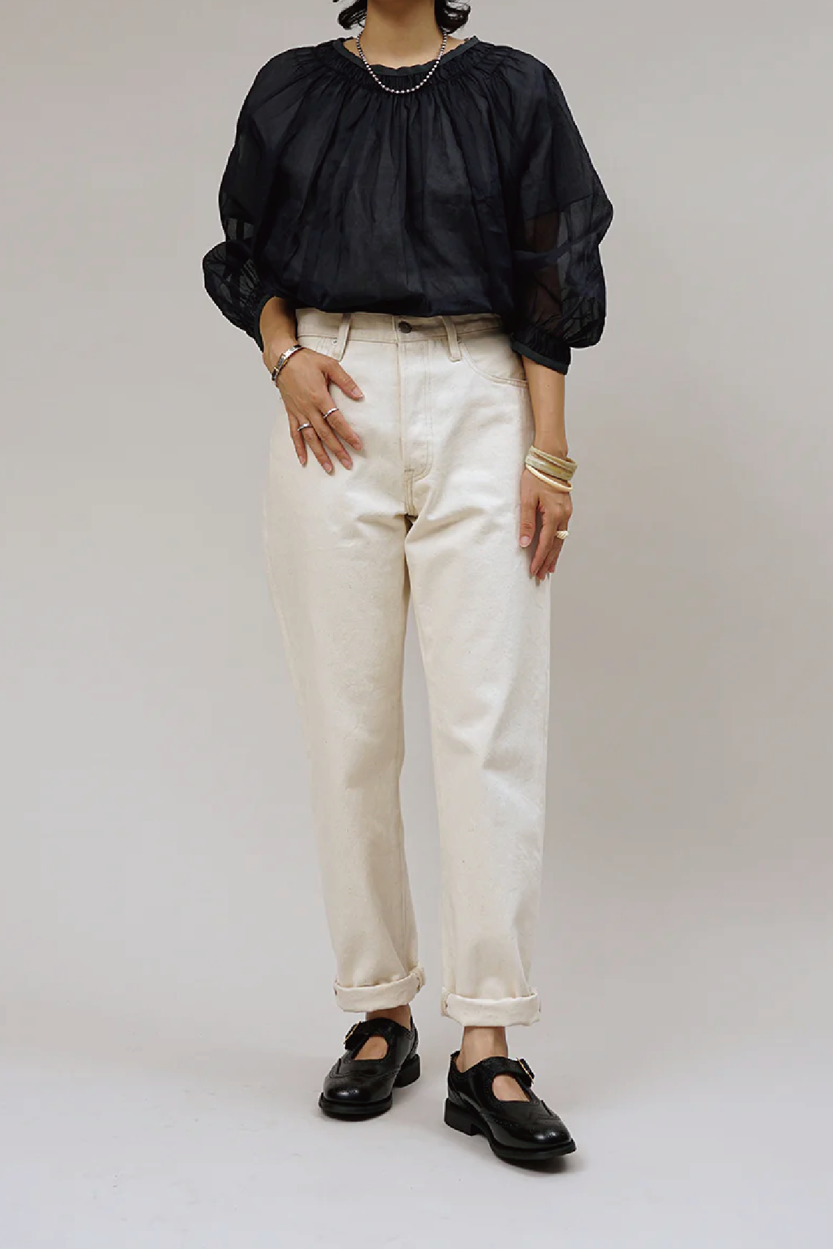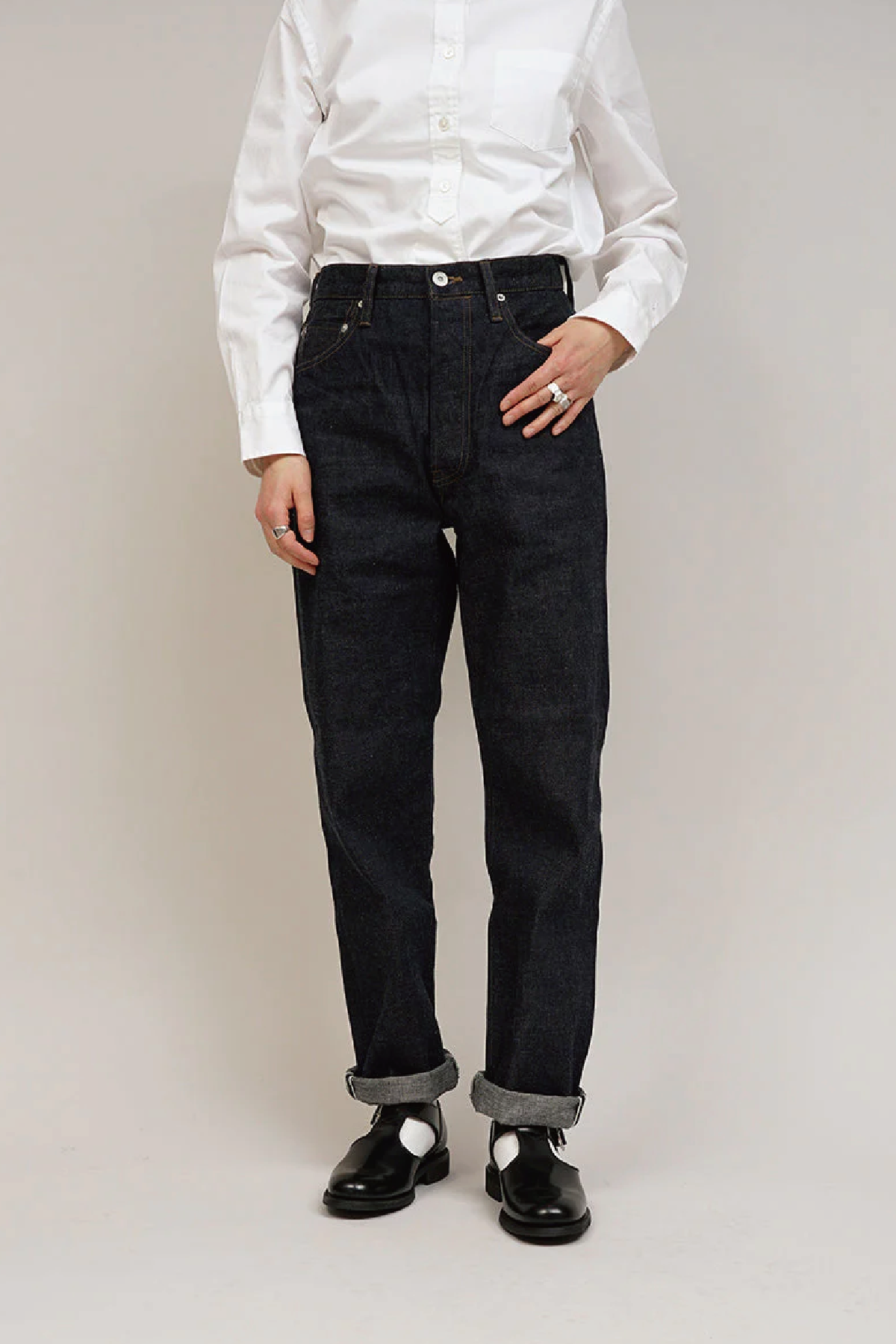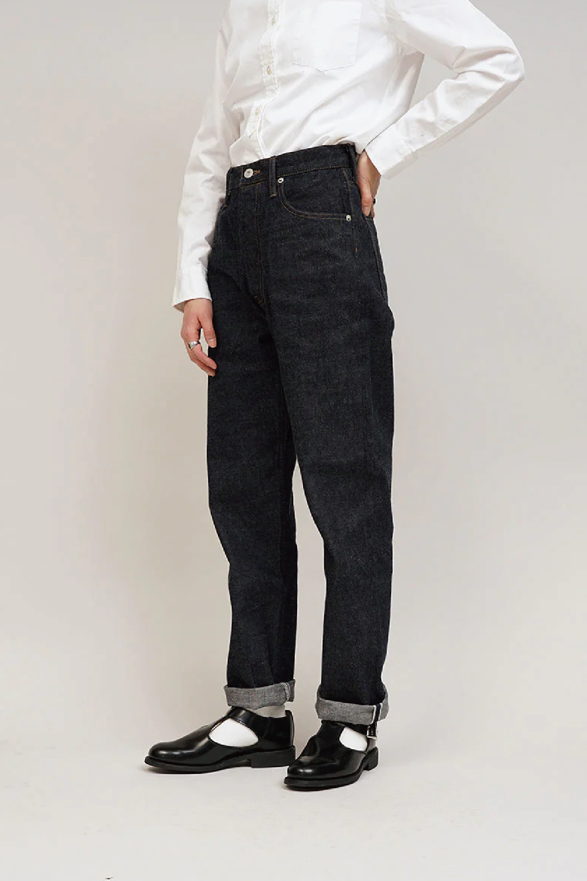 ・高腰錐形褲,腰部寬鬆,褲管線條到下擺逐漸變細