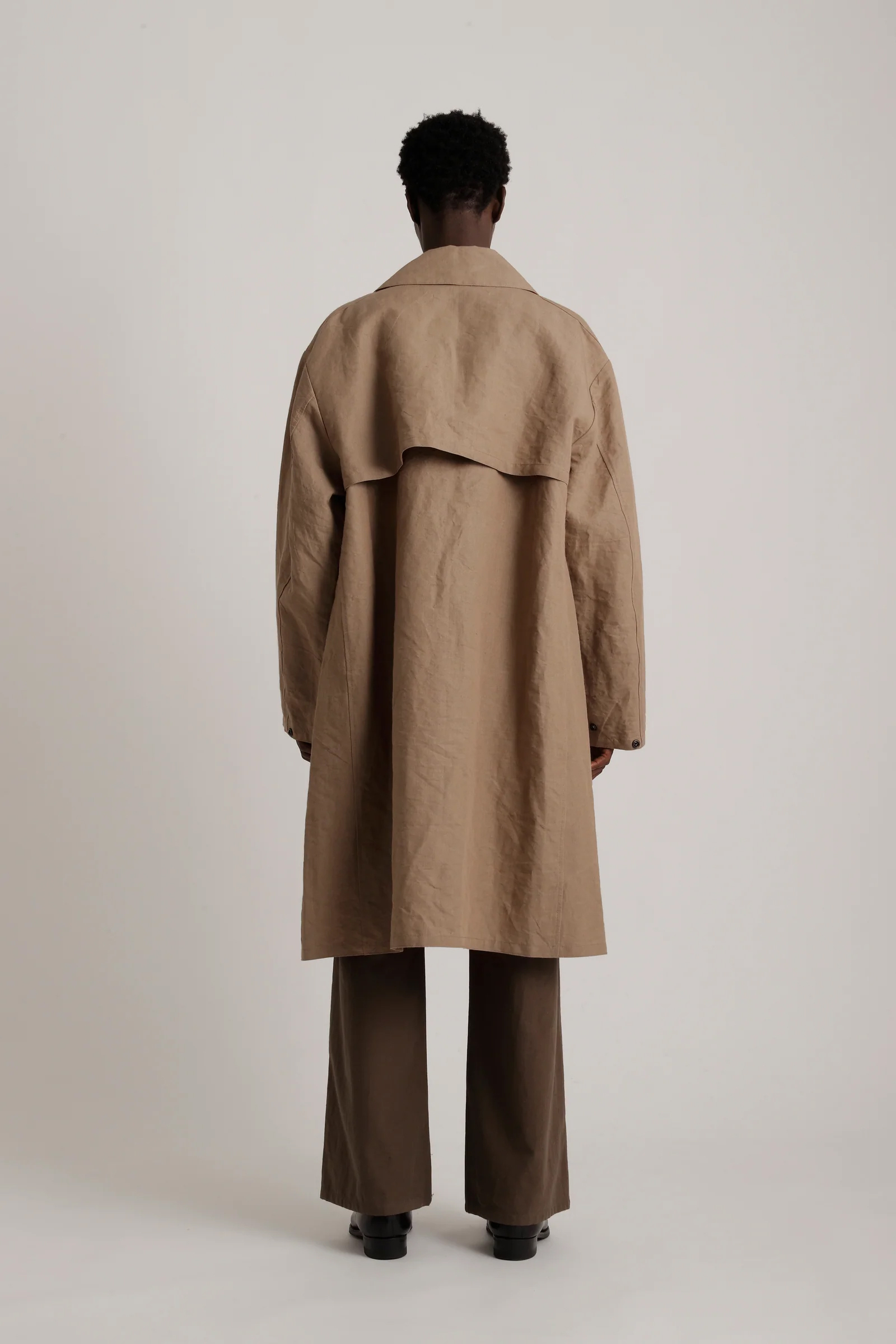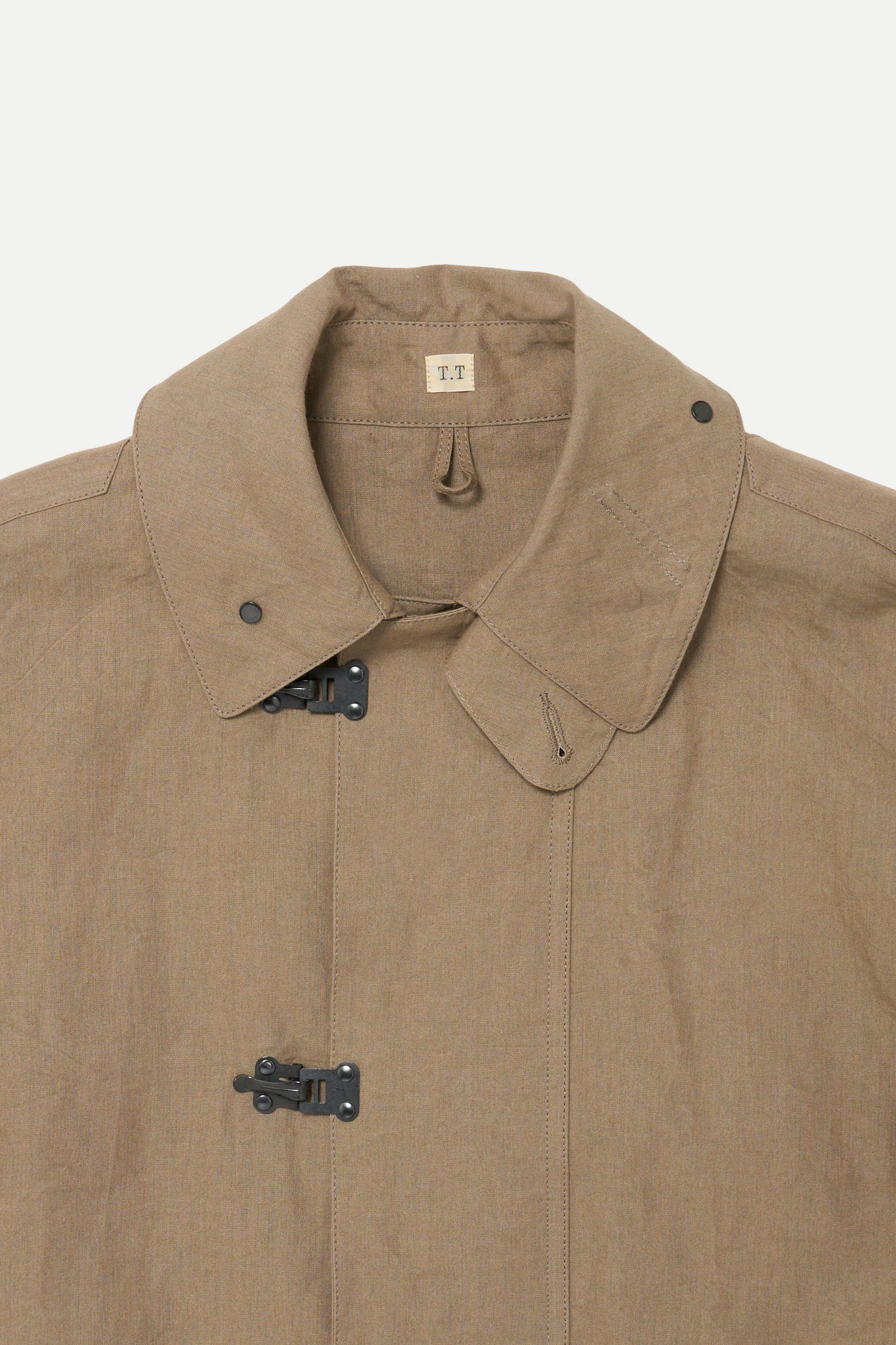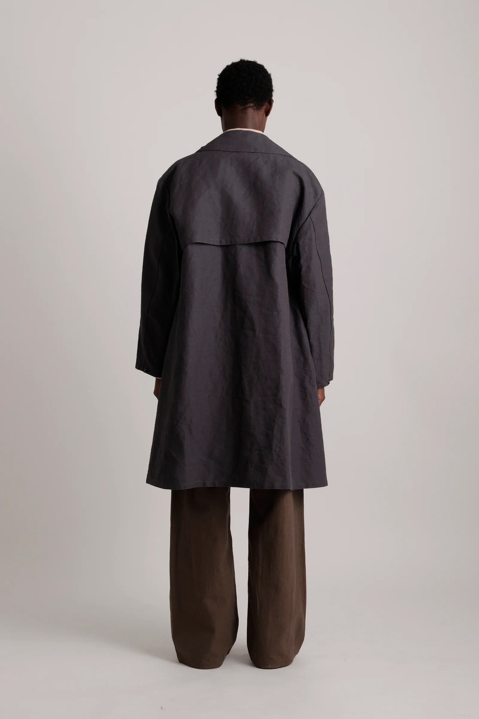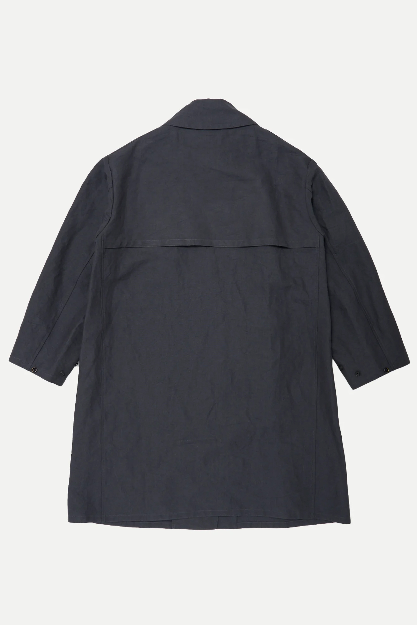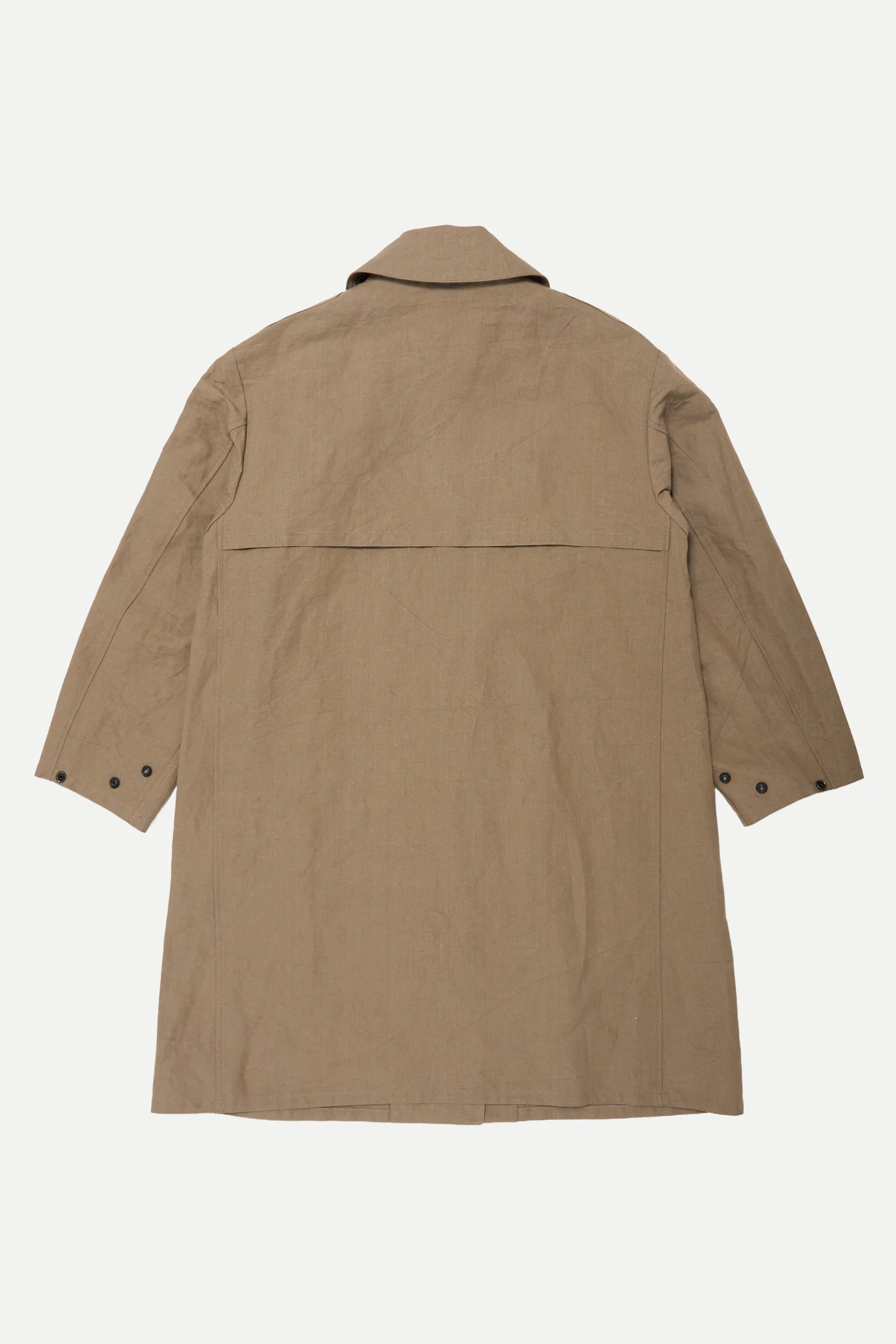 · 此款雨衣最初作為第一次世界大戰後期的軍用雨具使用,並在大蕭條時期再次被配發。原版材質為平織棉布,本款改採亞麻與和紙紗線織成的布料