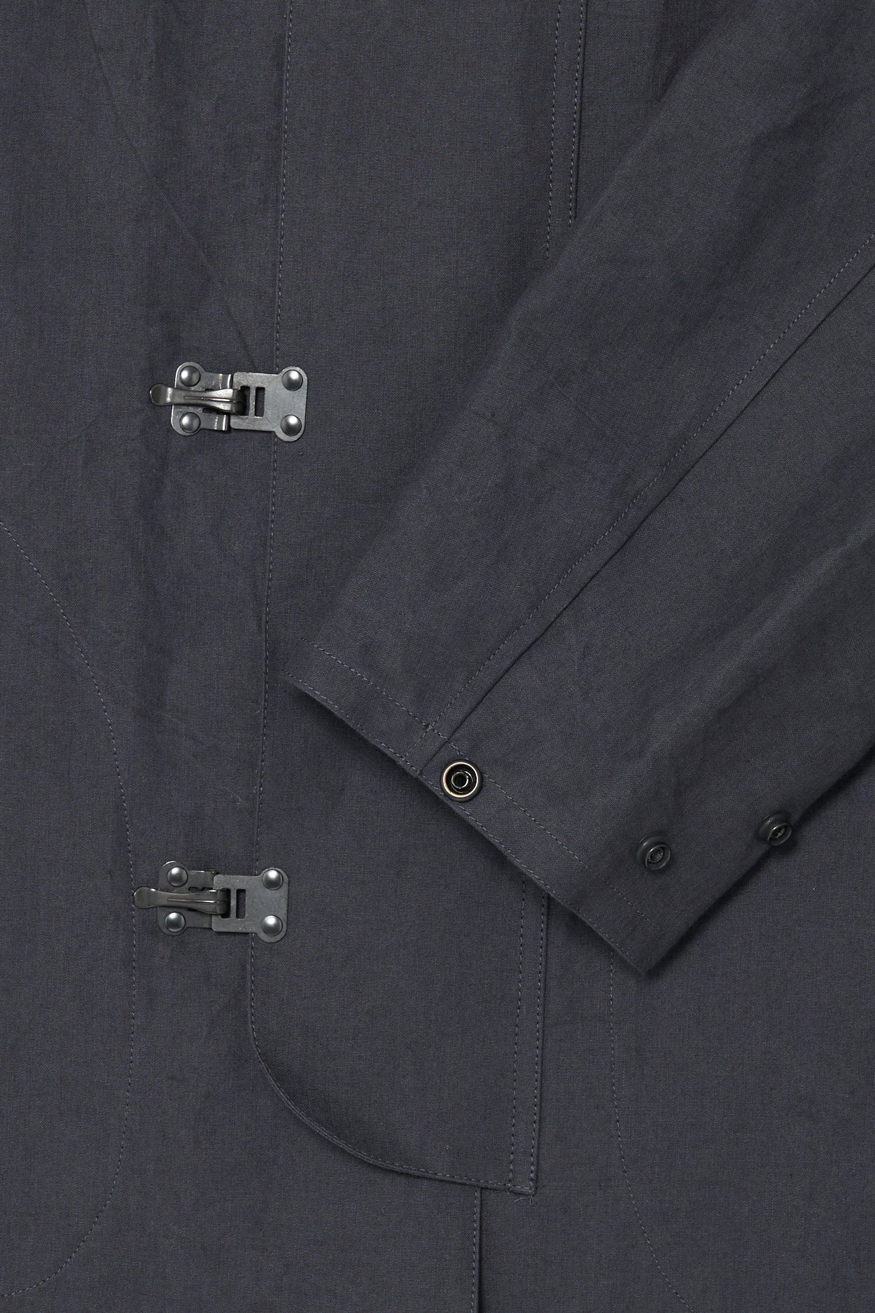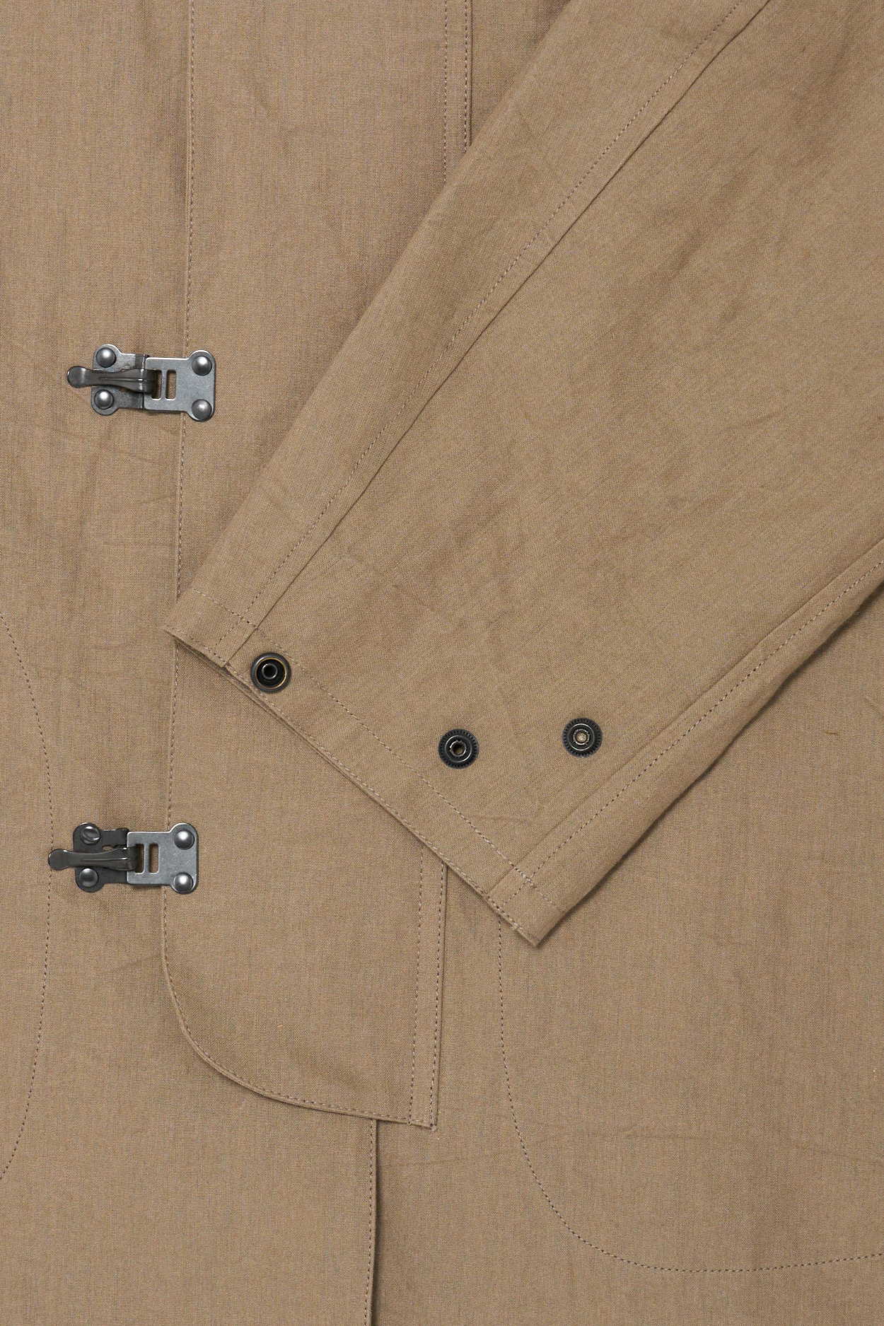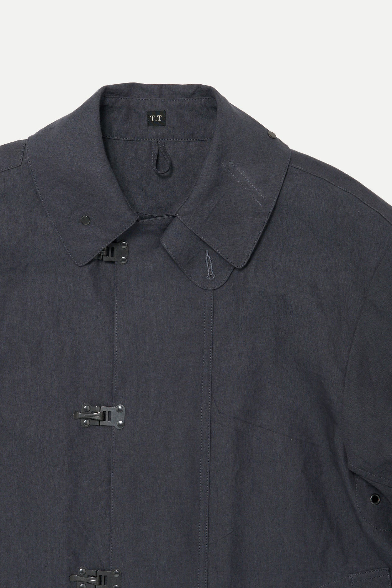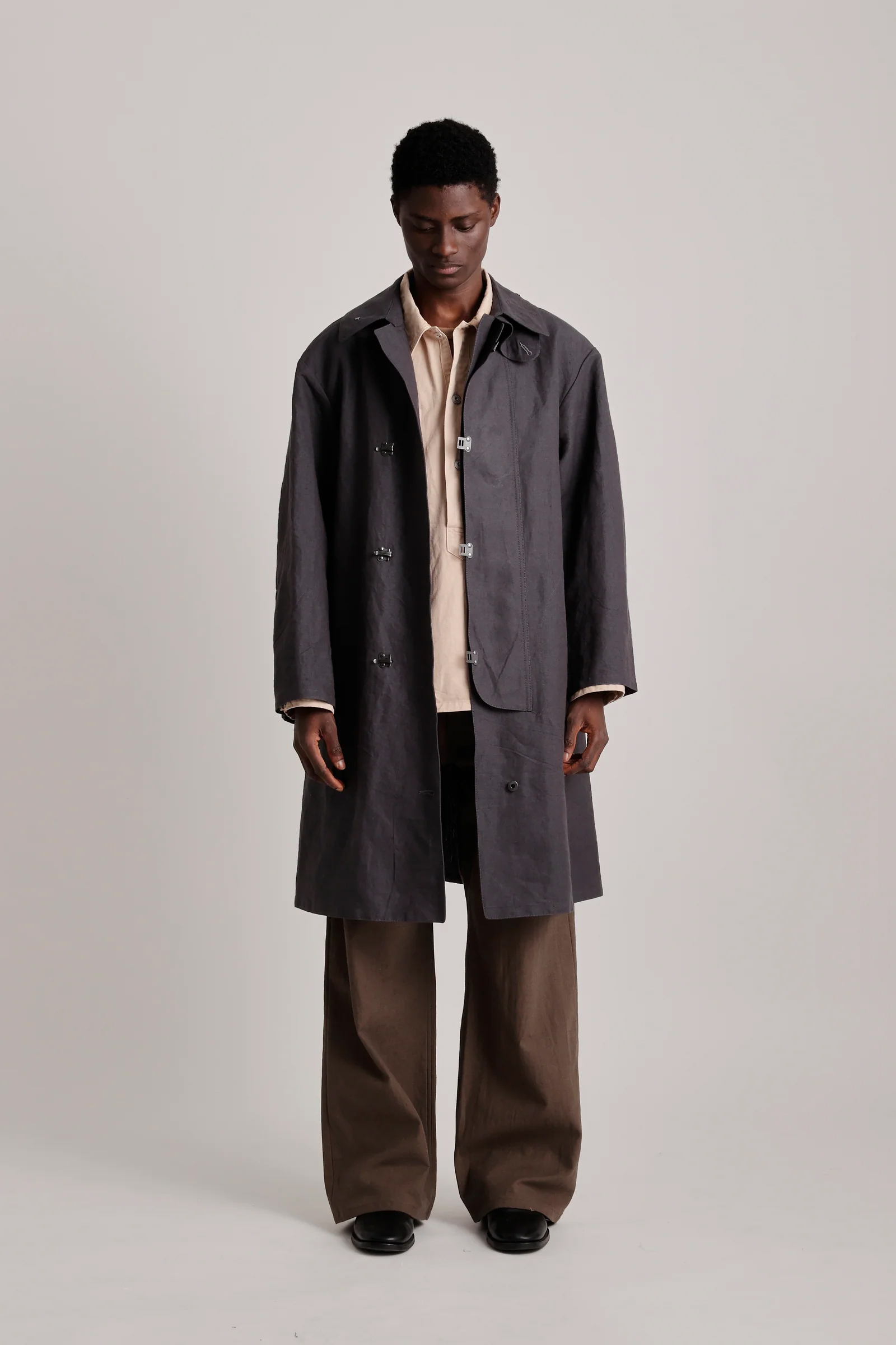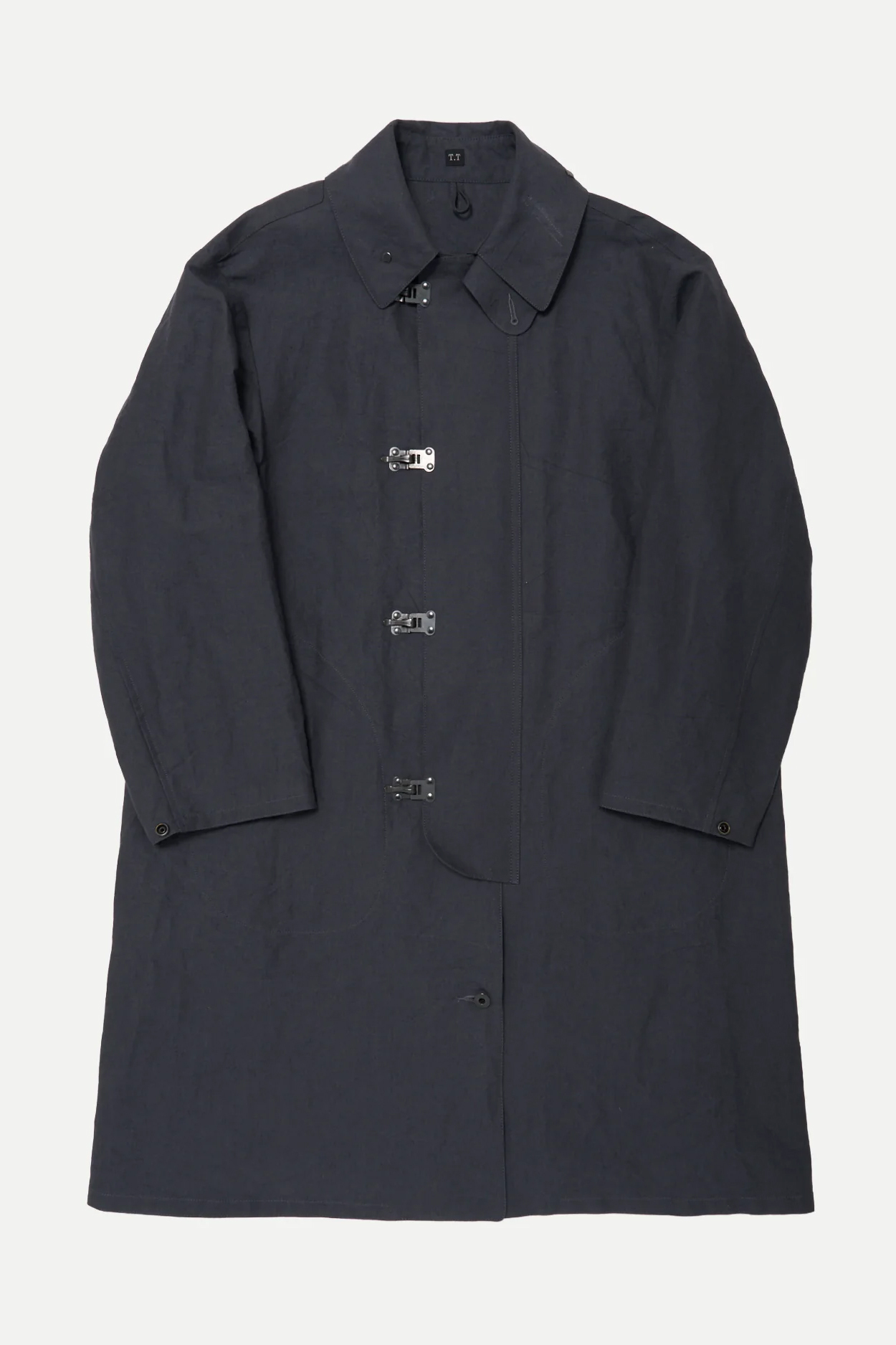 · 此款雨衣最初作為第一次世界大戰後期的軍用雨具使用,並在大蕭條時期再次被配發。原版材質為平織棉布,本款改採亞麻與和紙紗線織成的布料