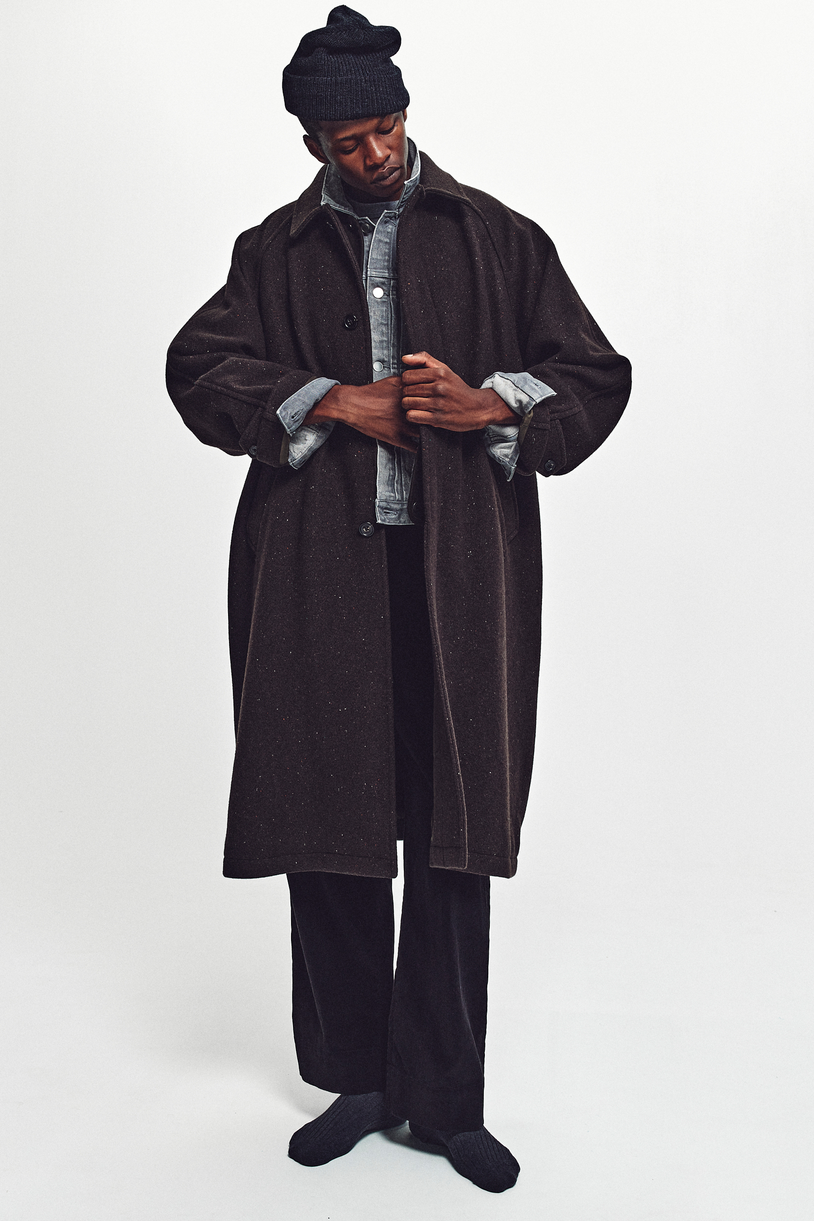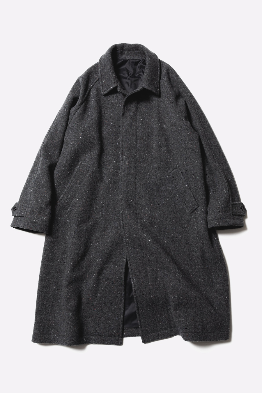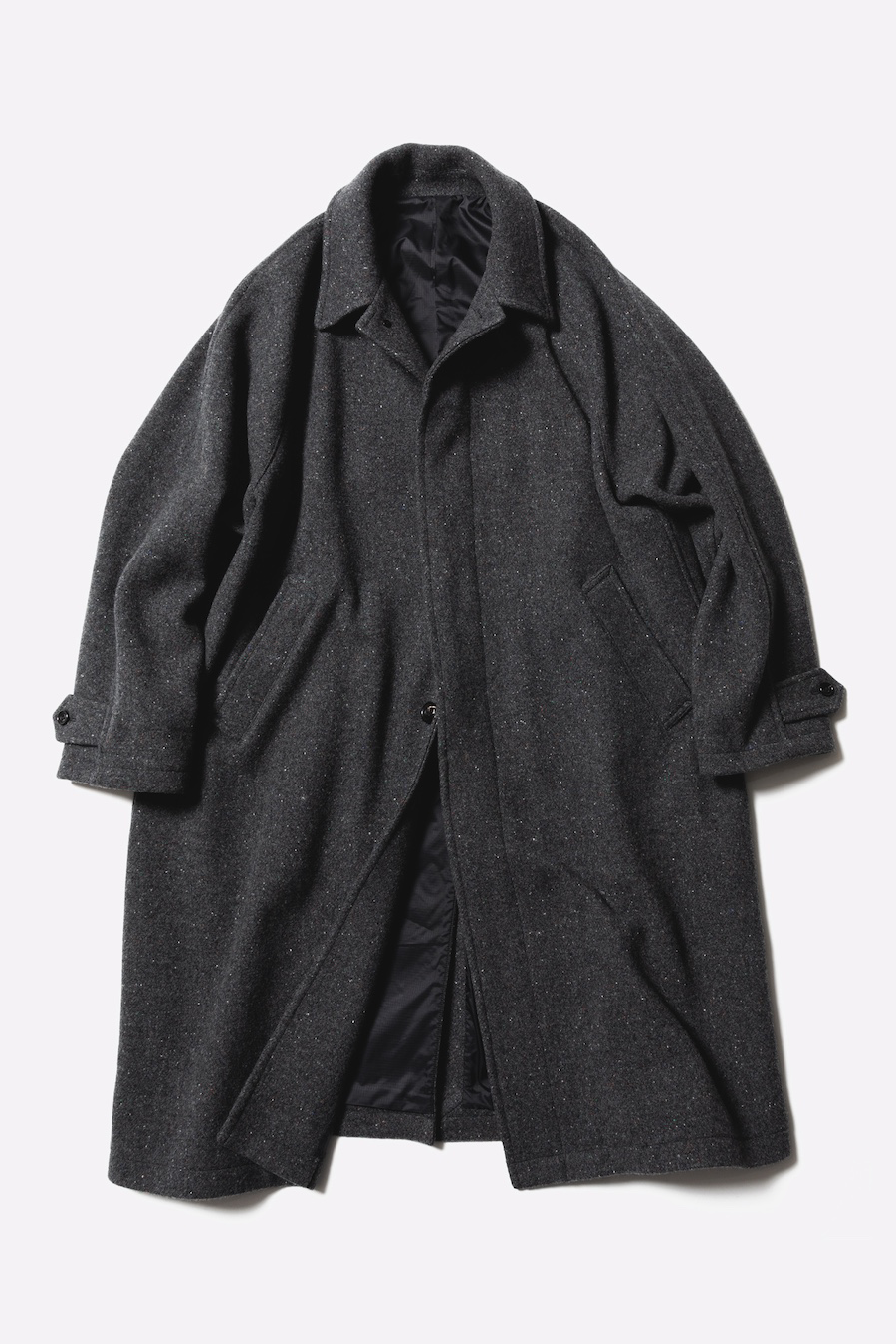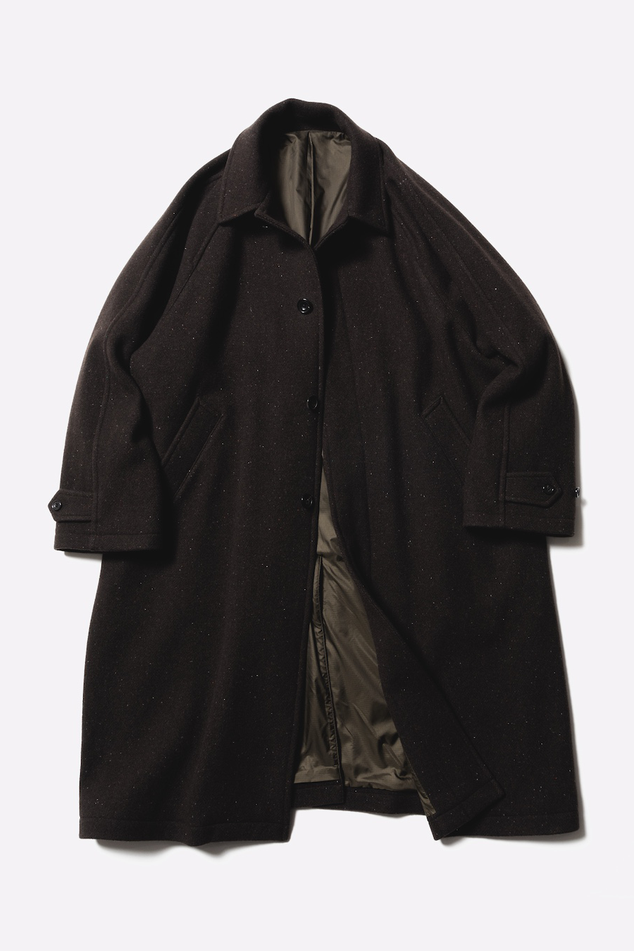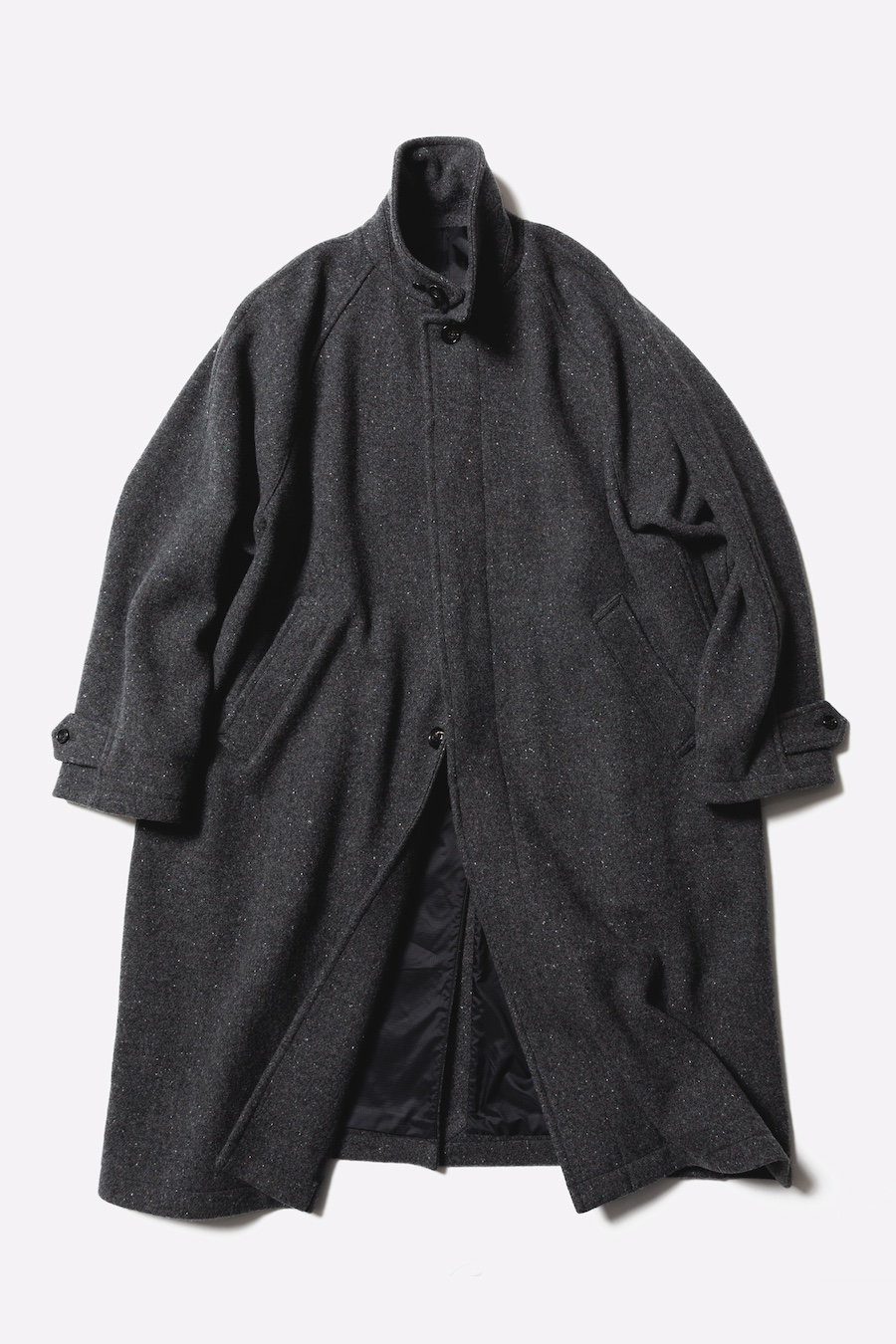 · 經典 Stern Collar 型大衣,採用拉格蘭袖設計,整體輪廓寬鬆,提供舒適的穿著感