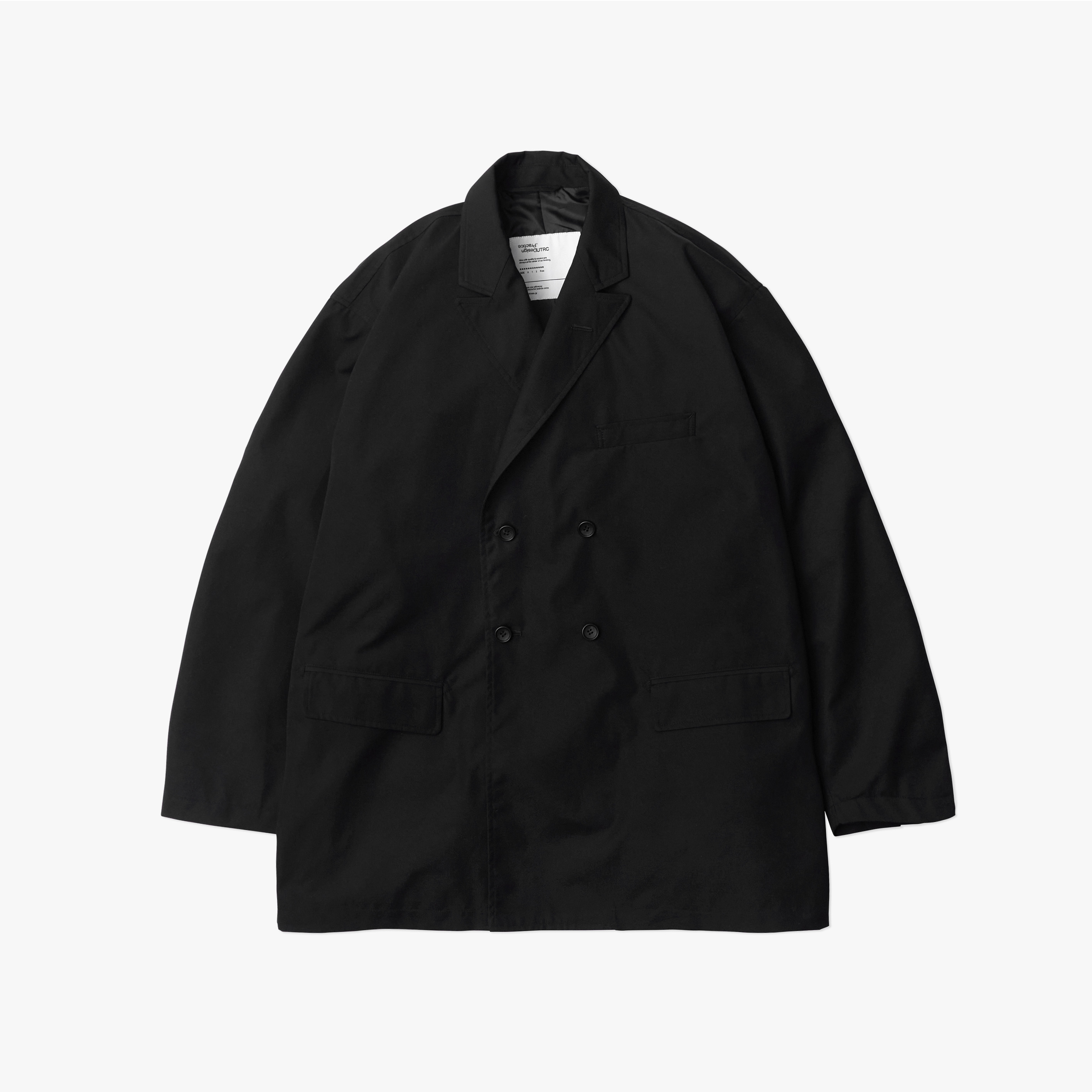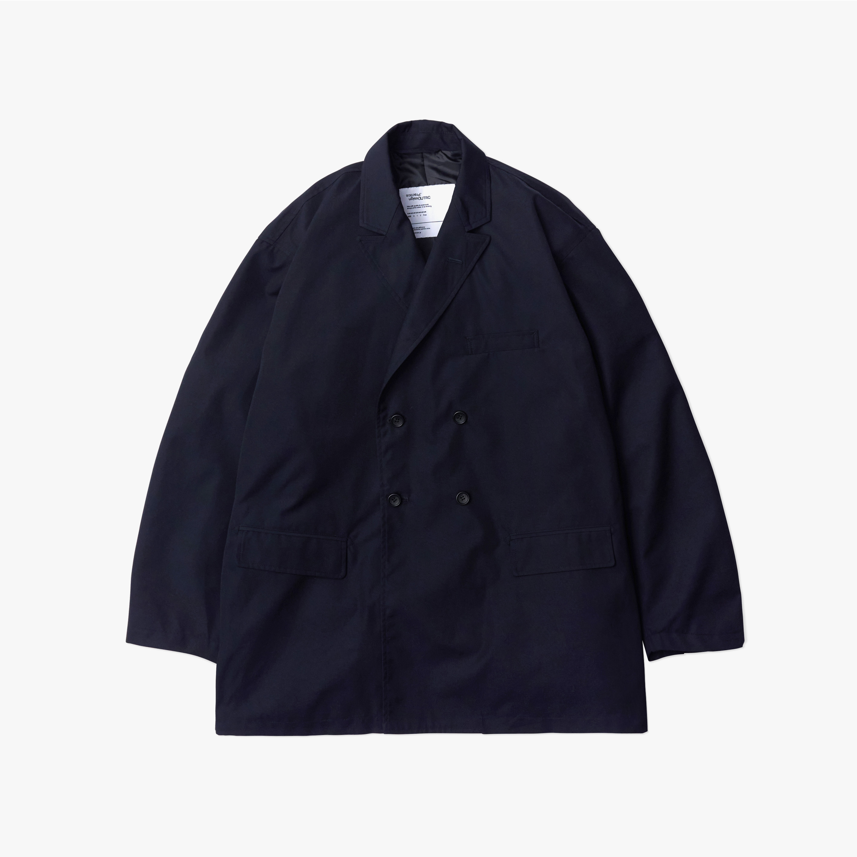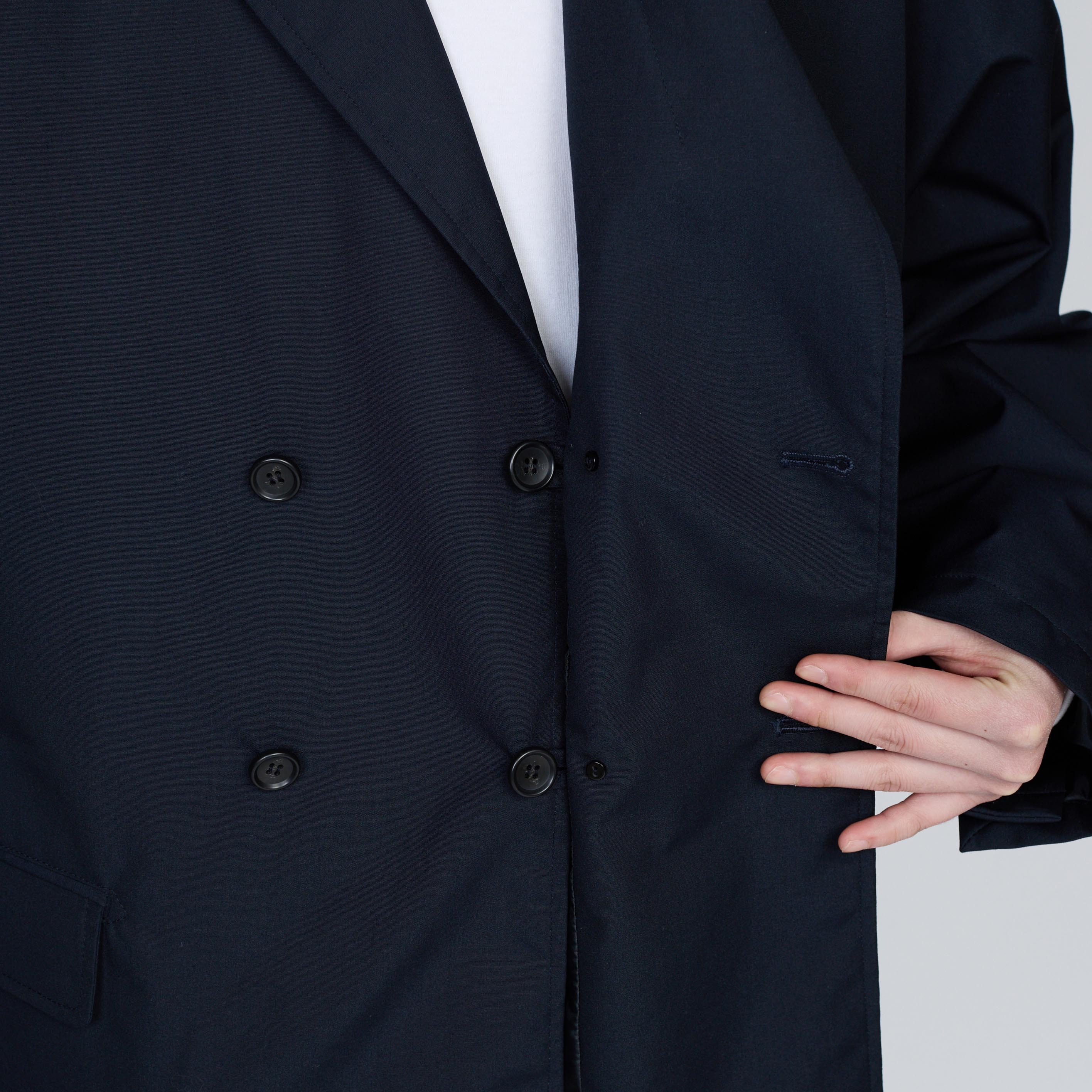 ・雙排扣設計以寬鬆箱型剪裁呈現,減輕傳統西裝的拘束感,透過講究的高領翻領比例與肩線位置設計,營造休閒的優雅造型