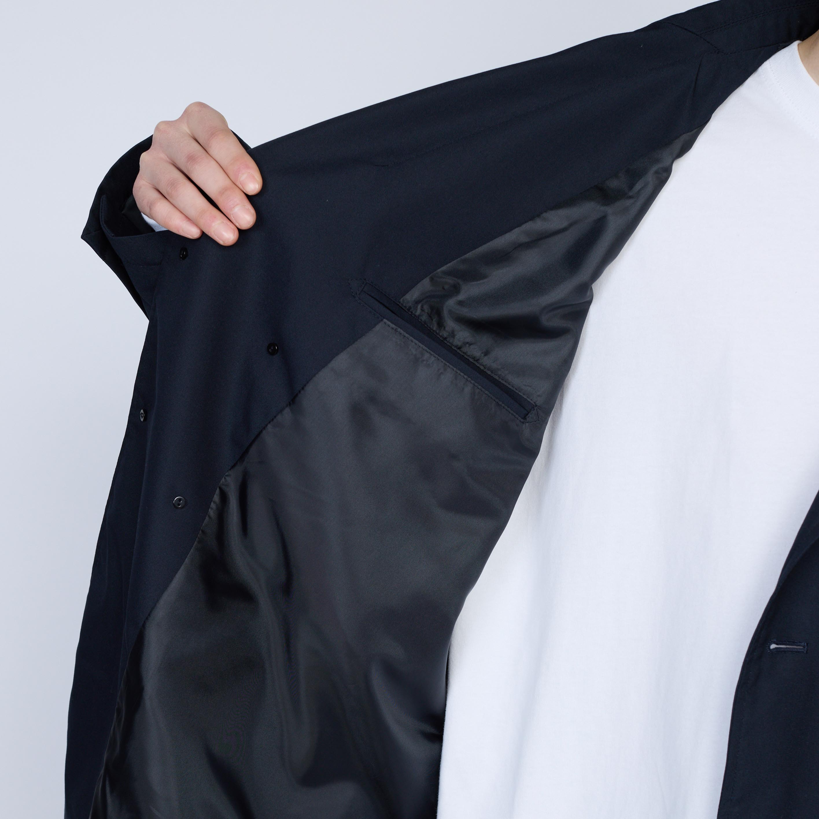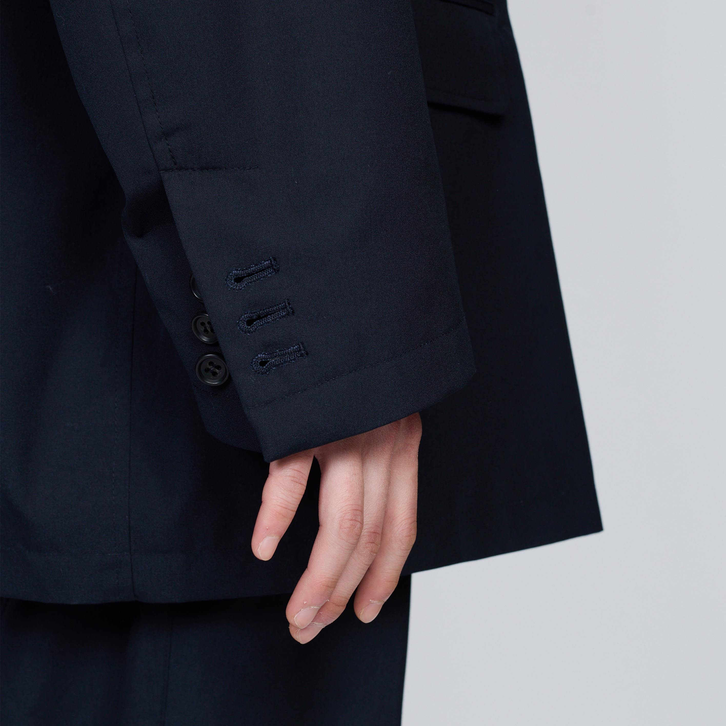 ・領口採用本切羽並搭配精緻額緣縫法,呈現正式西裝的工藝細節