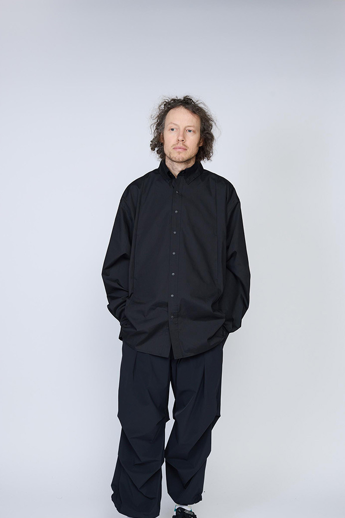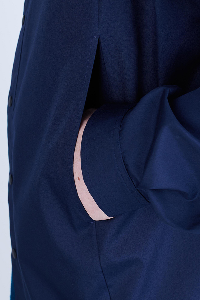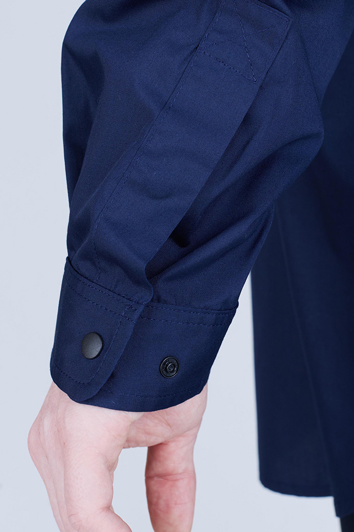 · 於領口、前襟與袖口皆使用壓扣,兼具現代極簡與輕鬆穿脫的機能性