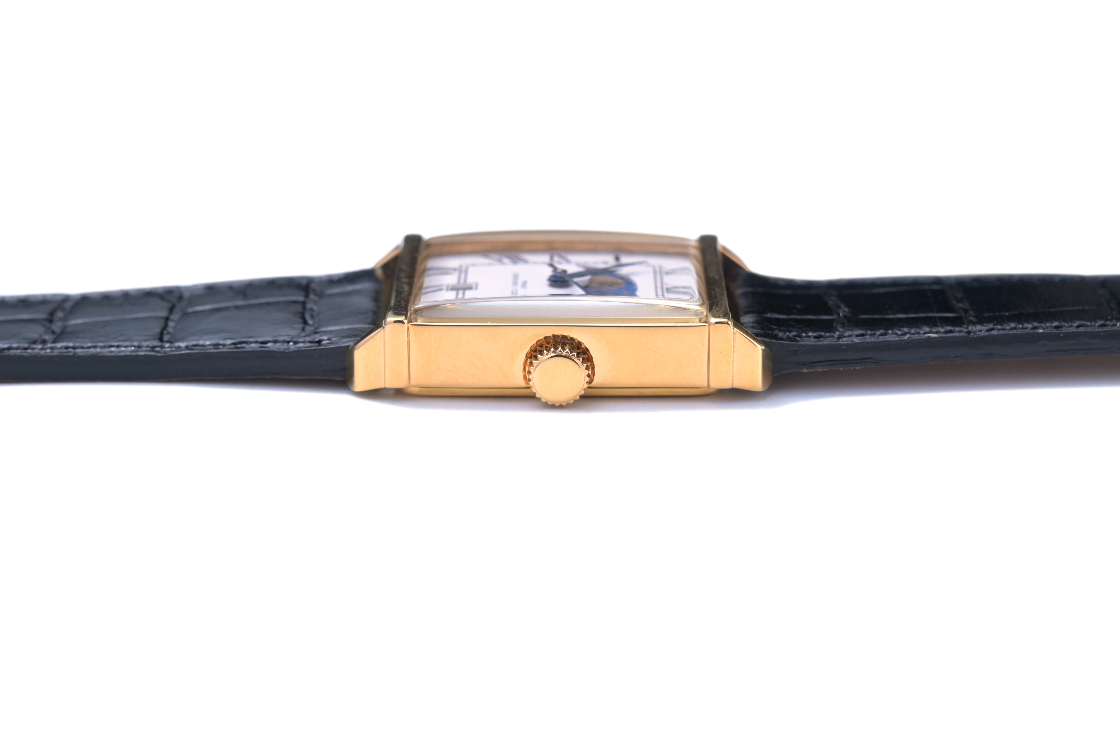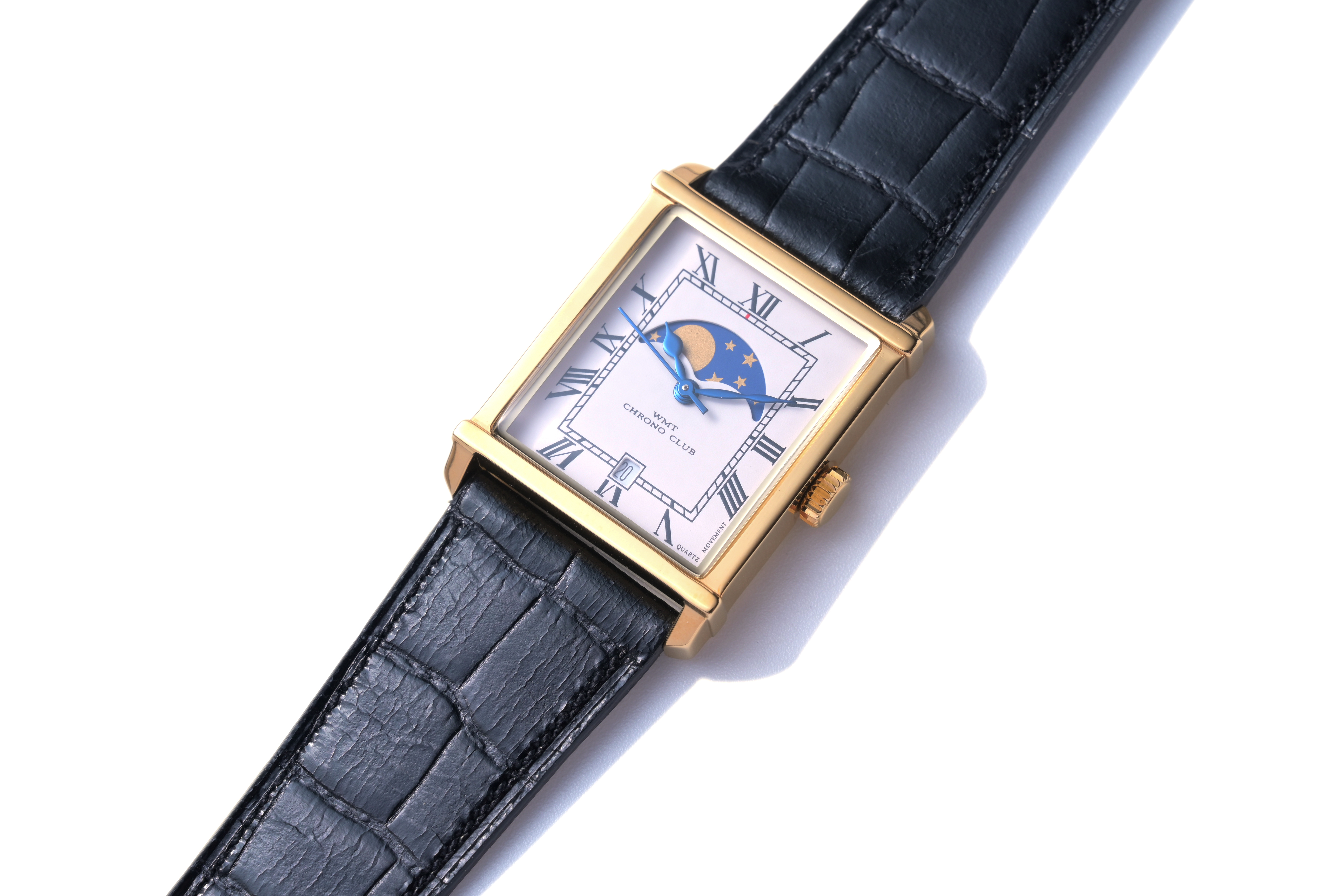 ・經典矩形錶殼搭載月相複雜功能,可顯示月亮的不同階段,例如新月、上弦月、滿月和下弦月
