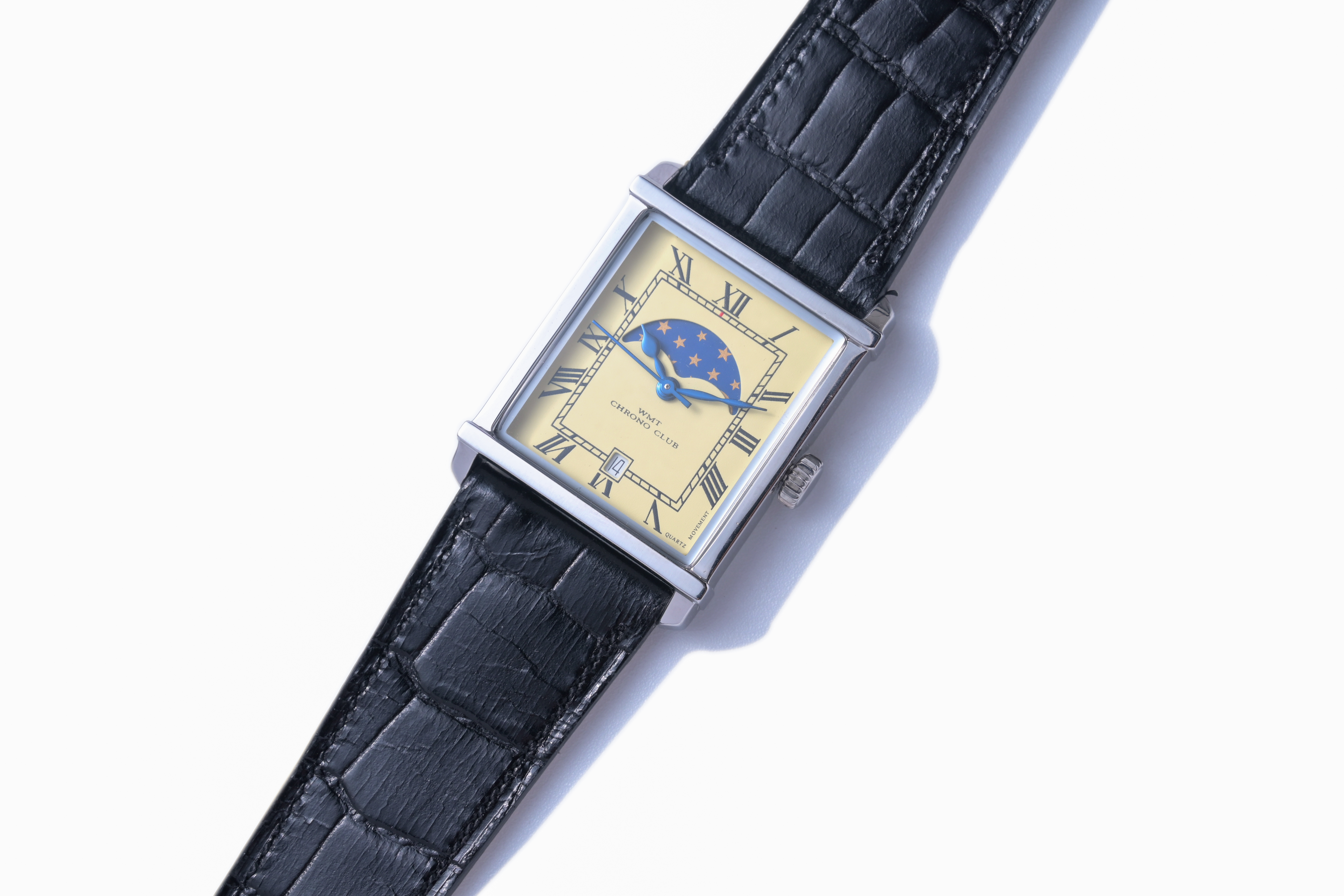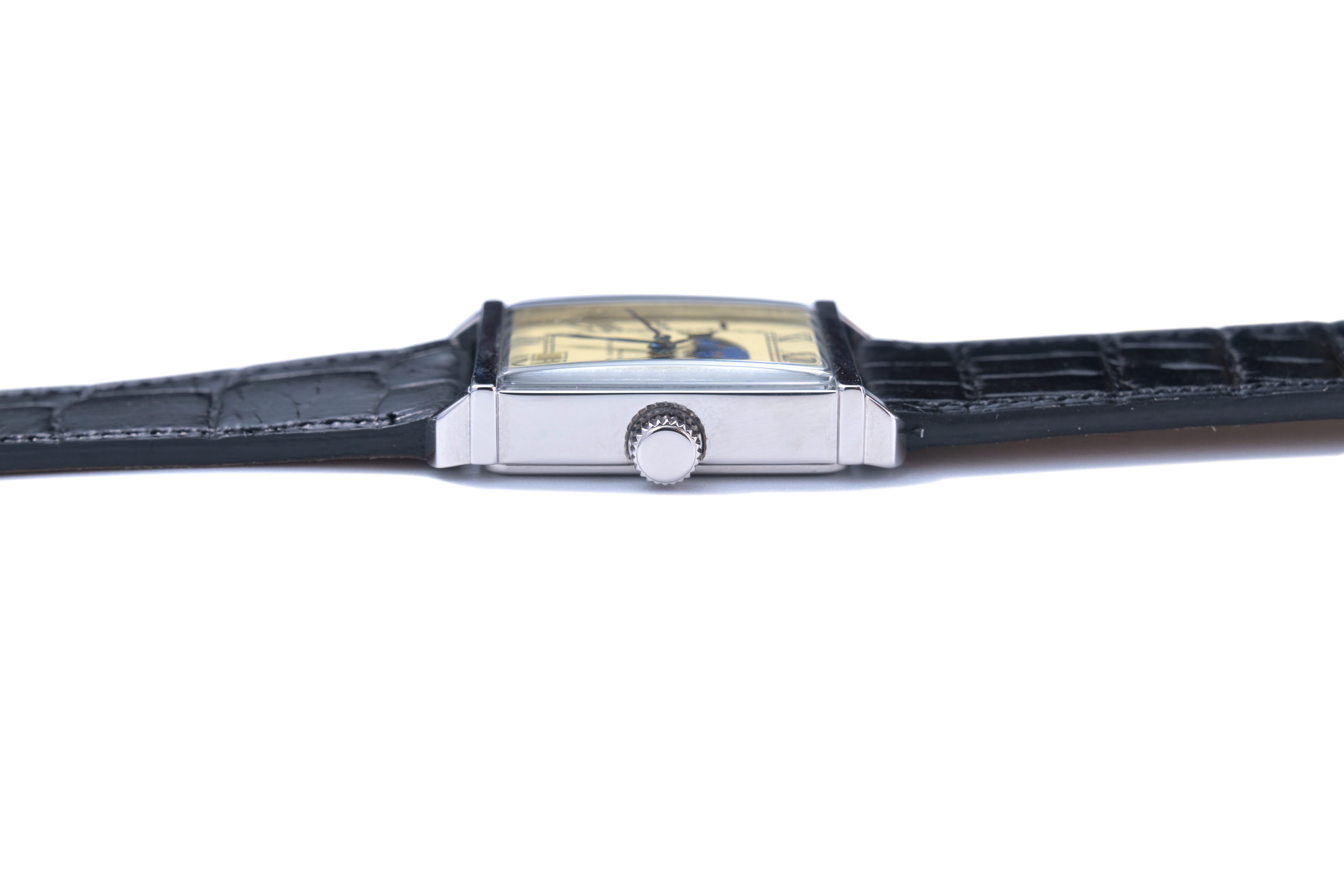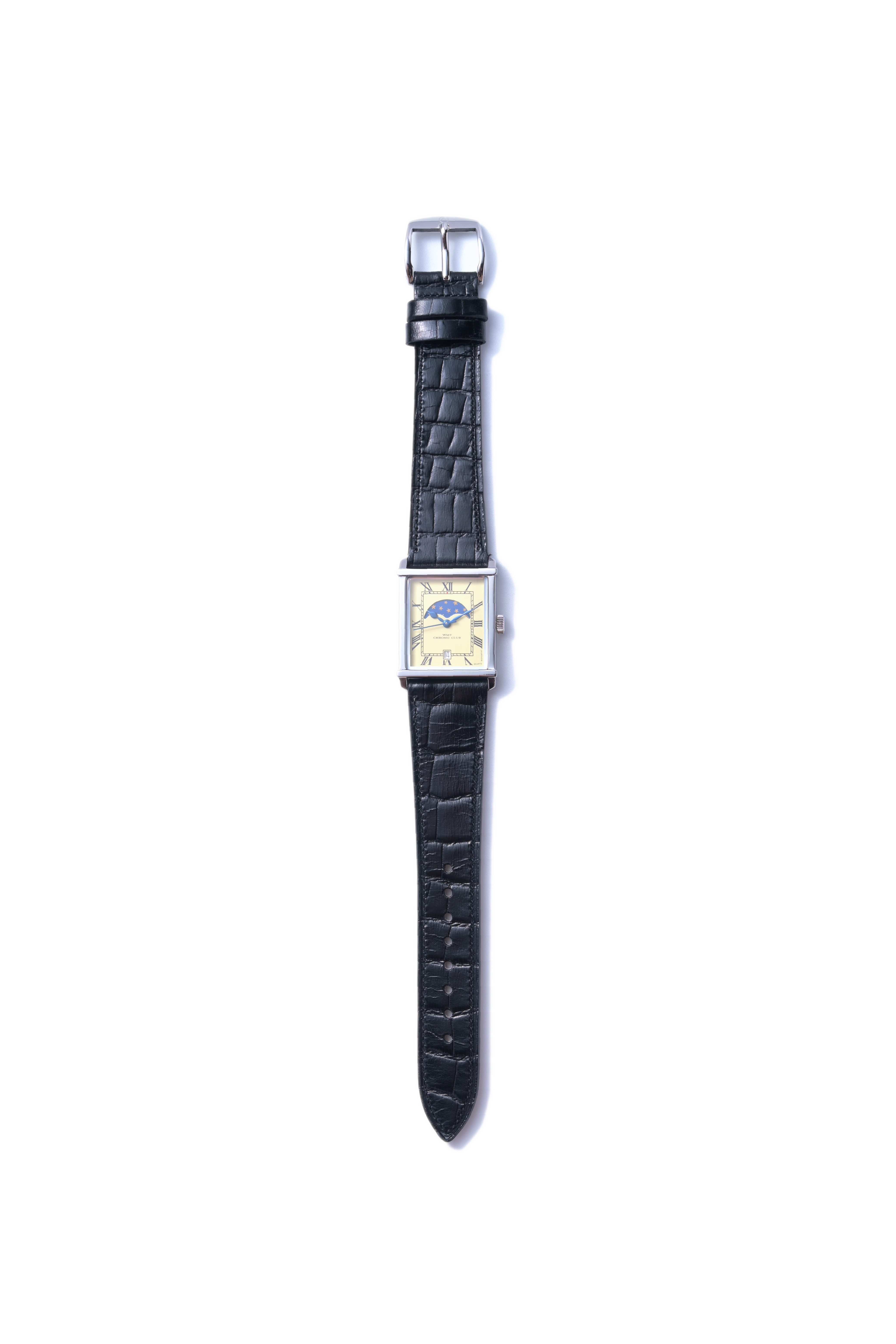 ・經典矩形錶殼搭載月相複雜功能,可顯示月亮的不同階段,例如新月、上弦月、滿月和下弦月
