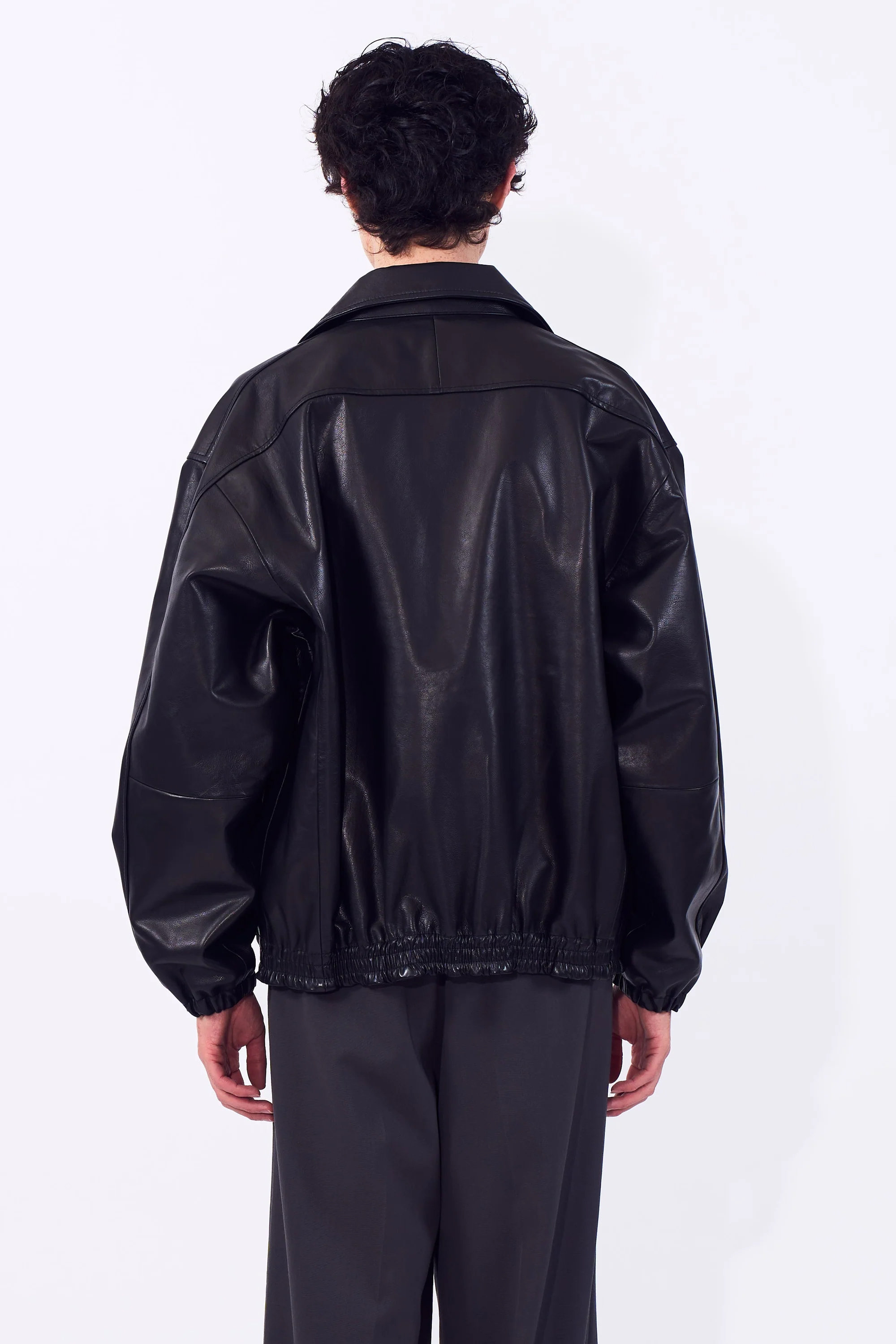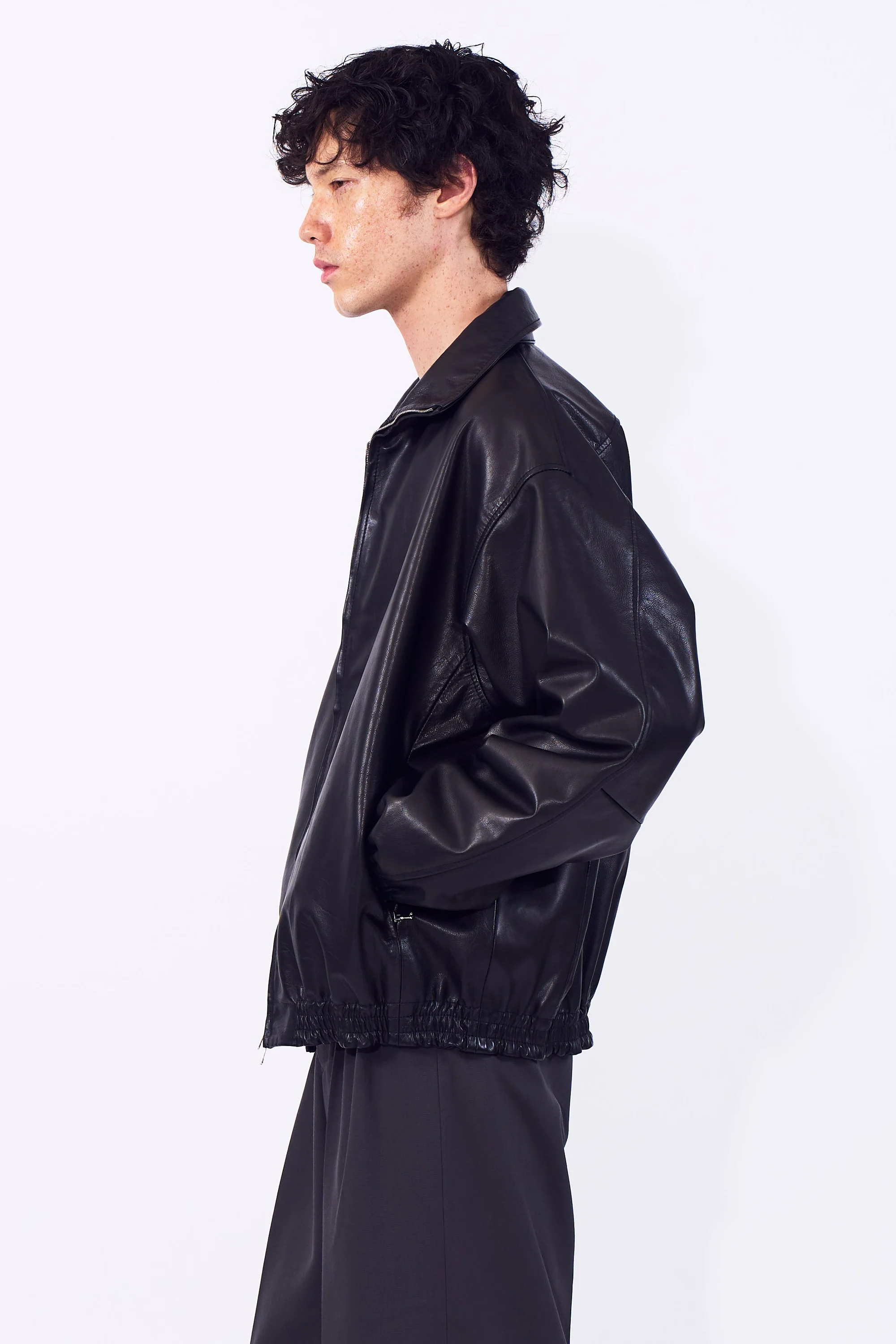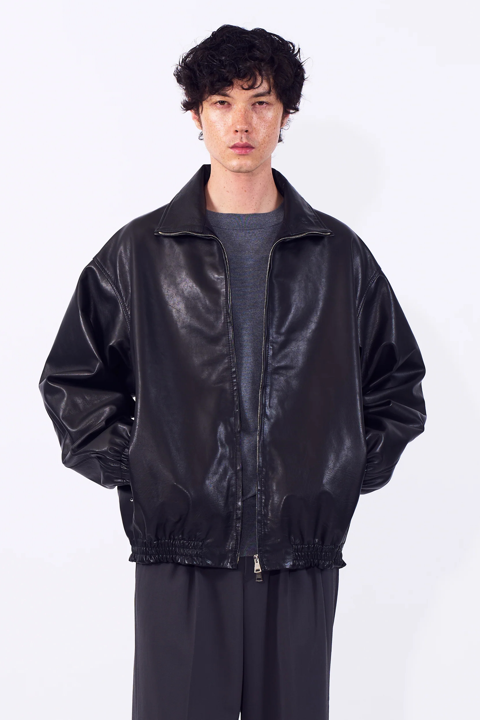 · 寬版剪裁的立領皮夾克,搭配袖窿設計,並透過下擺與袖口的鬆緊收口形成鮮明輪廓