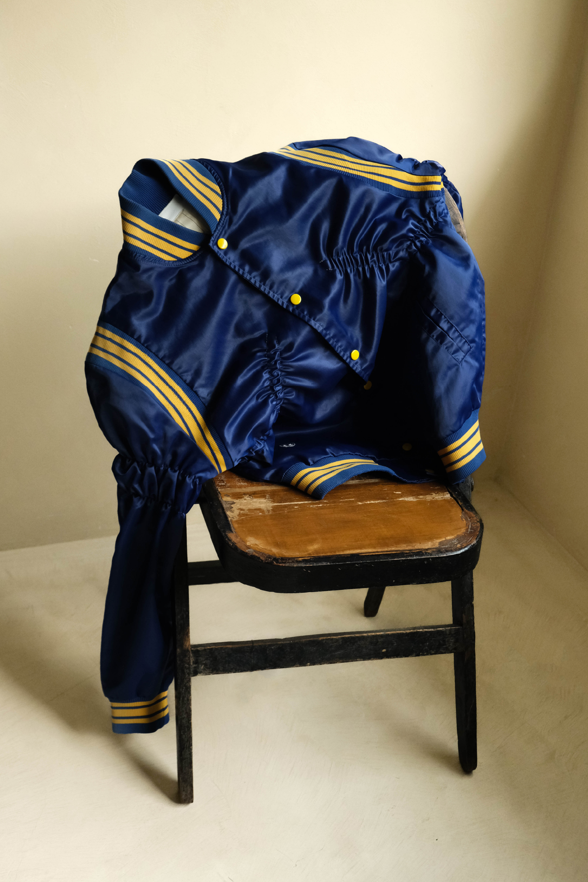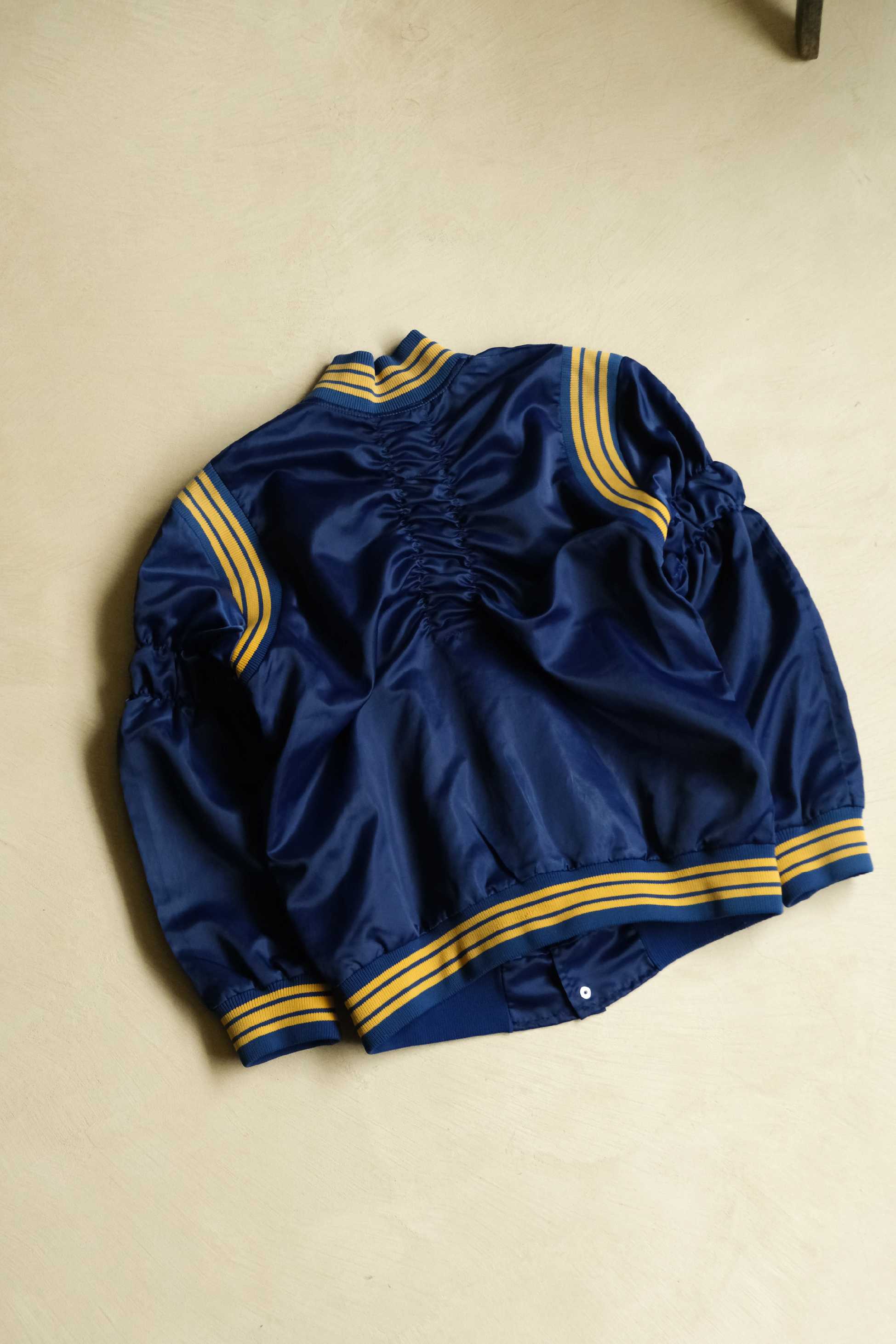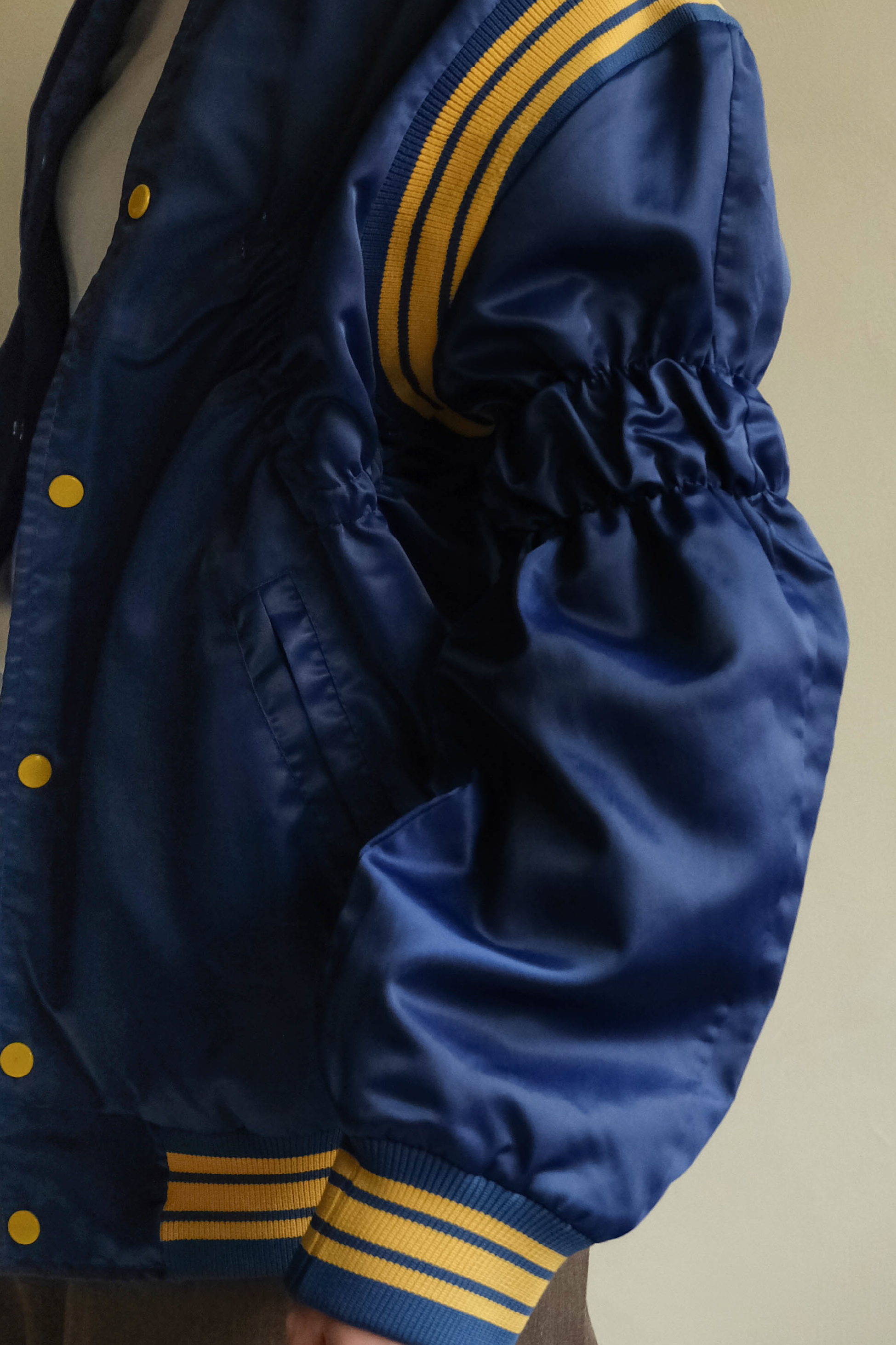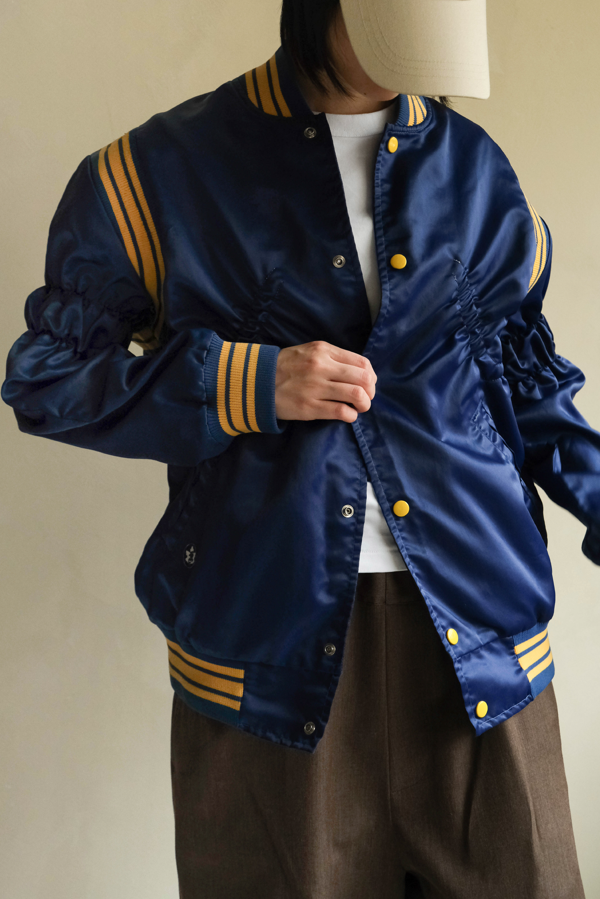 ・經典棒球外套輪廓,結合光澤感面料,呈現復古與現代交織的風格。