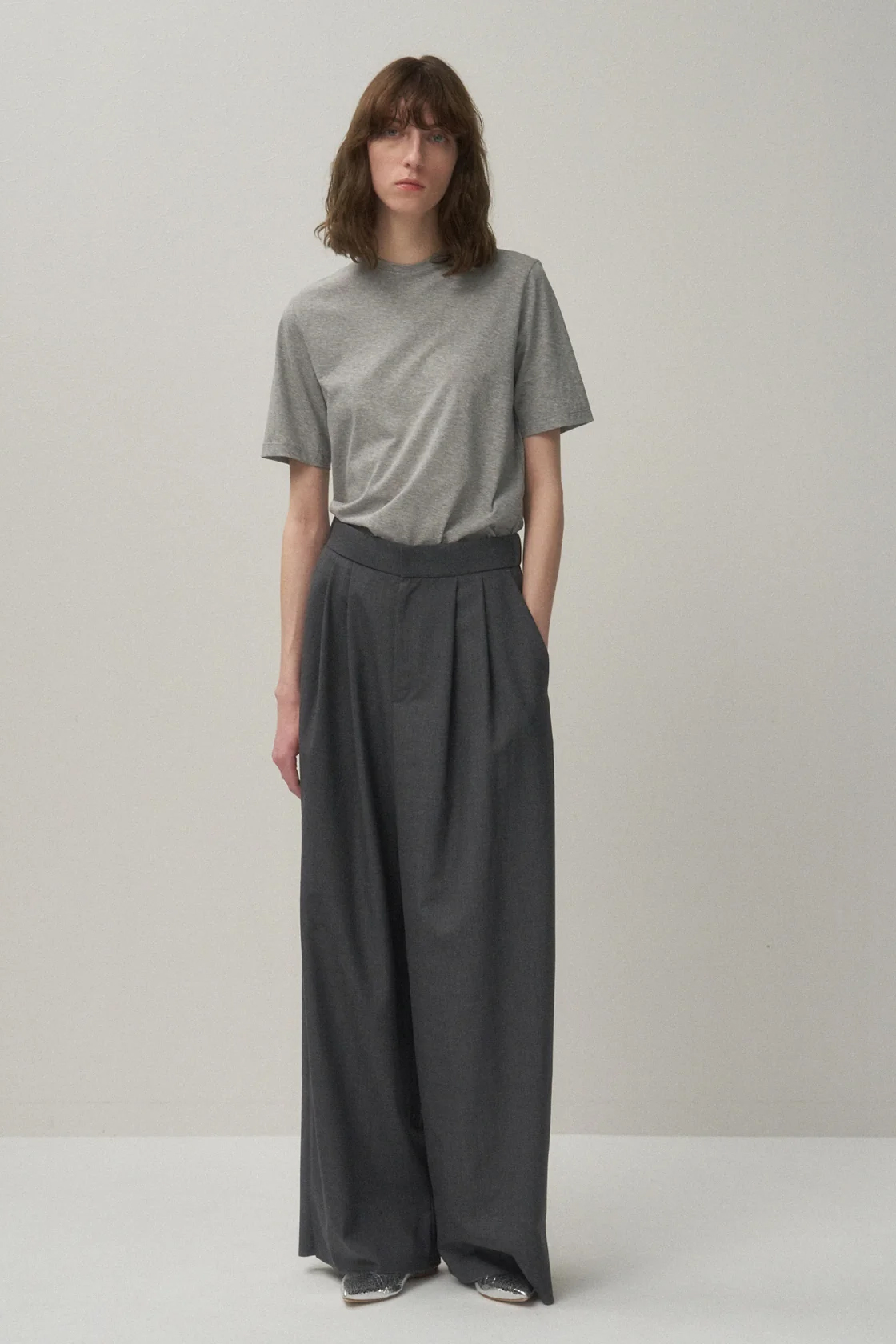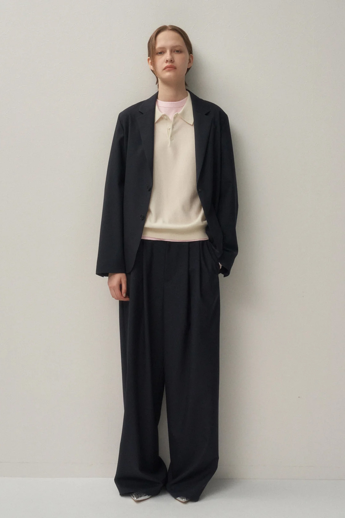 · 以 1920 年代牛津寬褲為靈感打造的雙打褶寬版長褲,褲型自腰部向下筆直落下,線條乾淨俐落,輪廓極具存在感。外觀如同男裝西裝褲般端正,但穿著設定刻意保留輕鬆感
