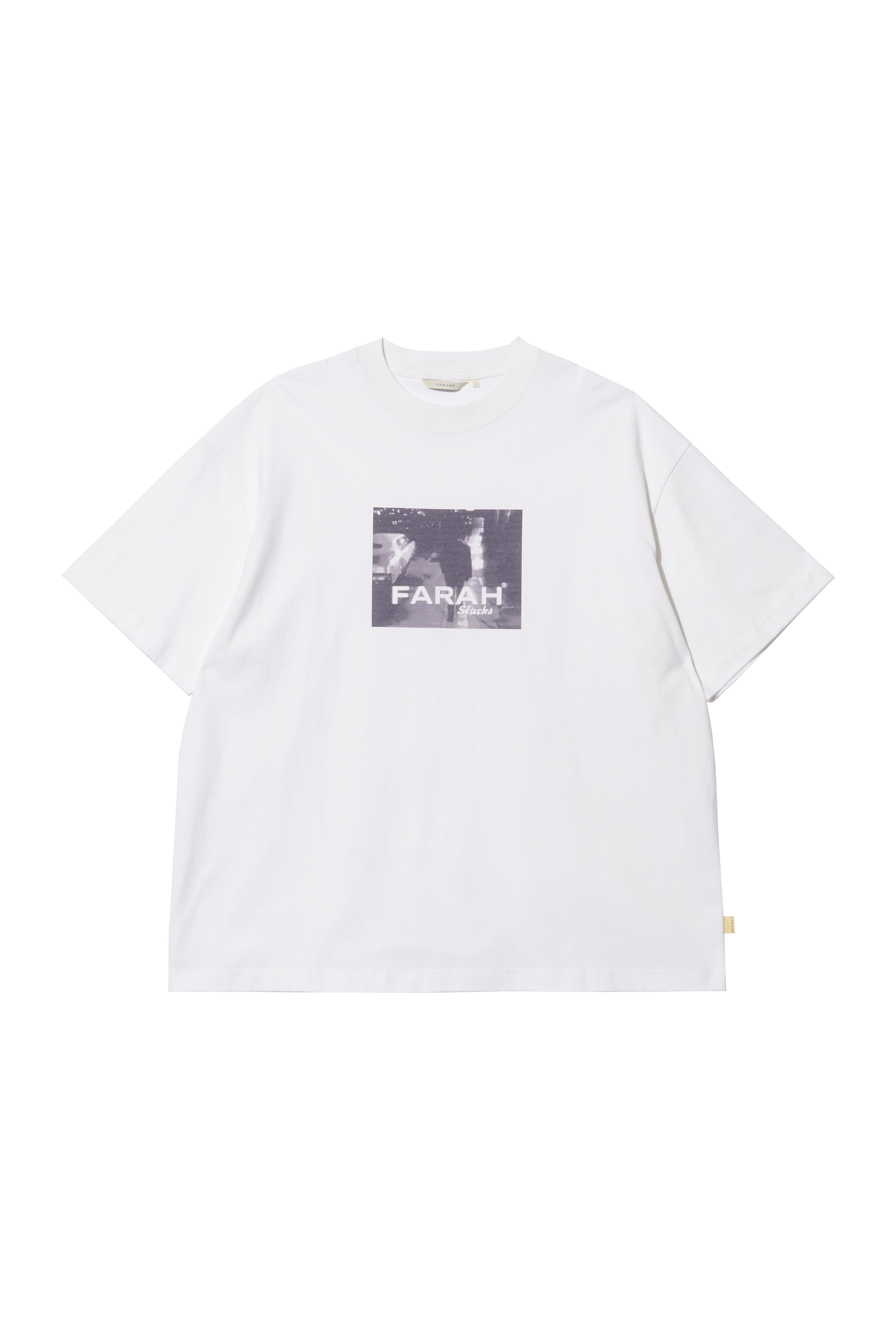 ・採用帶有城市氛圍的黑白攝影印花,搭配品牌字樣「FARAH Slacks」