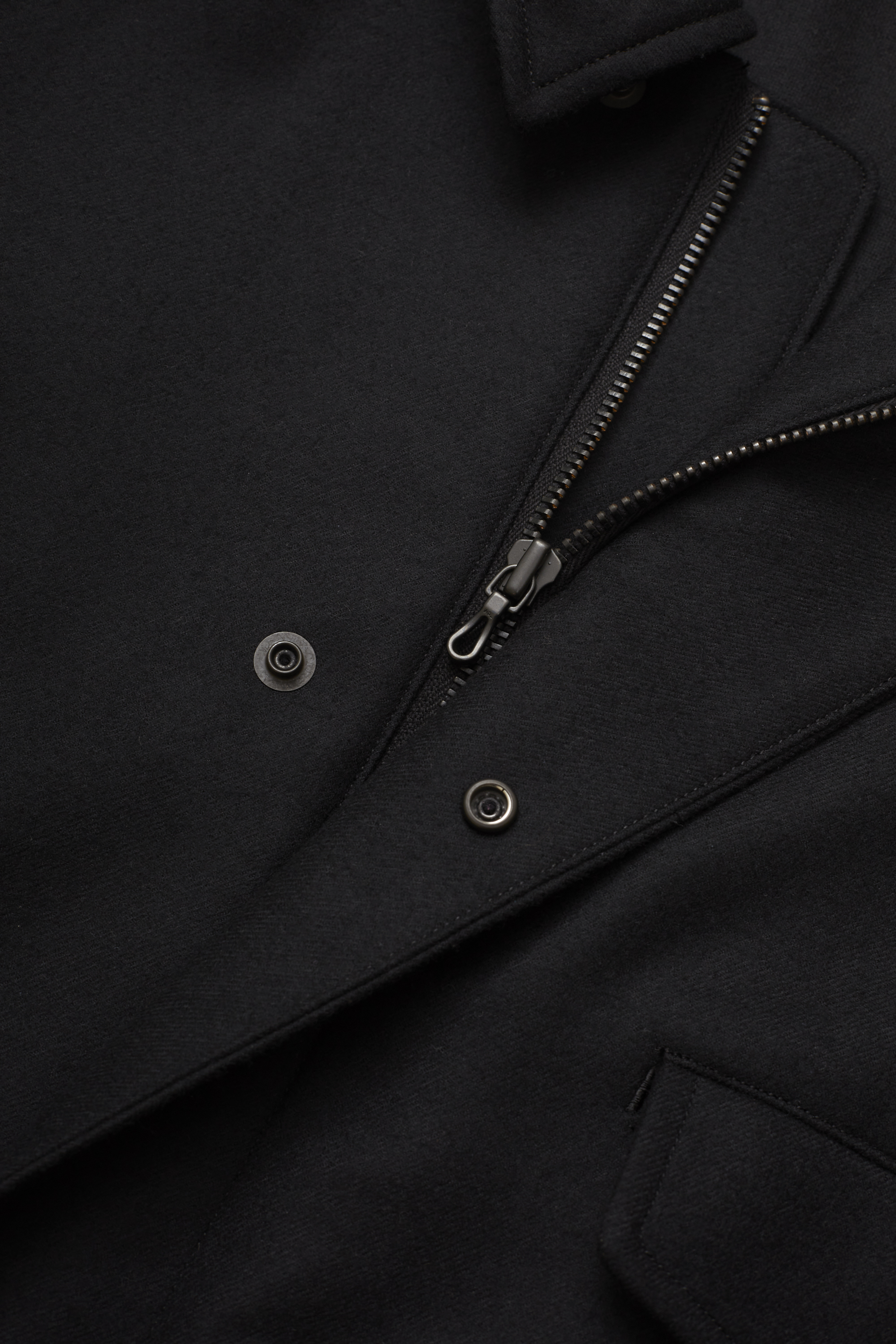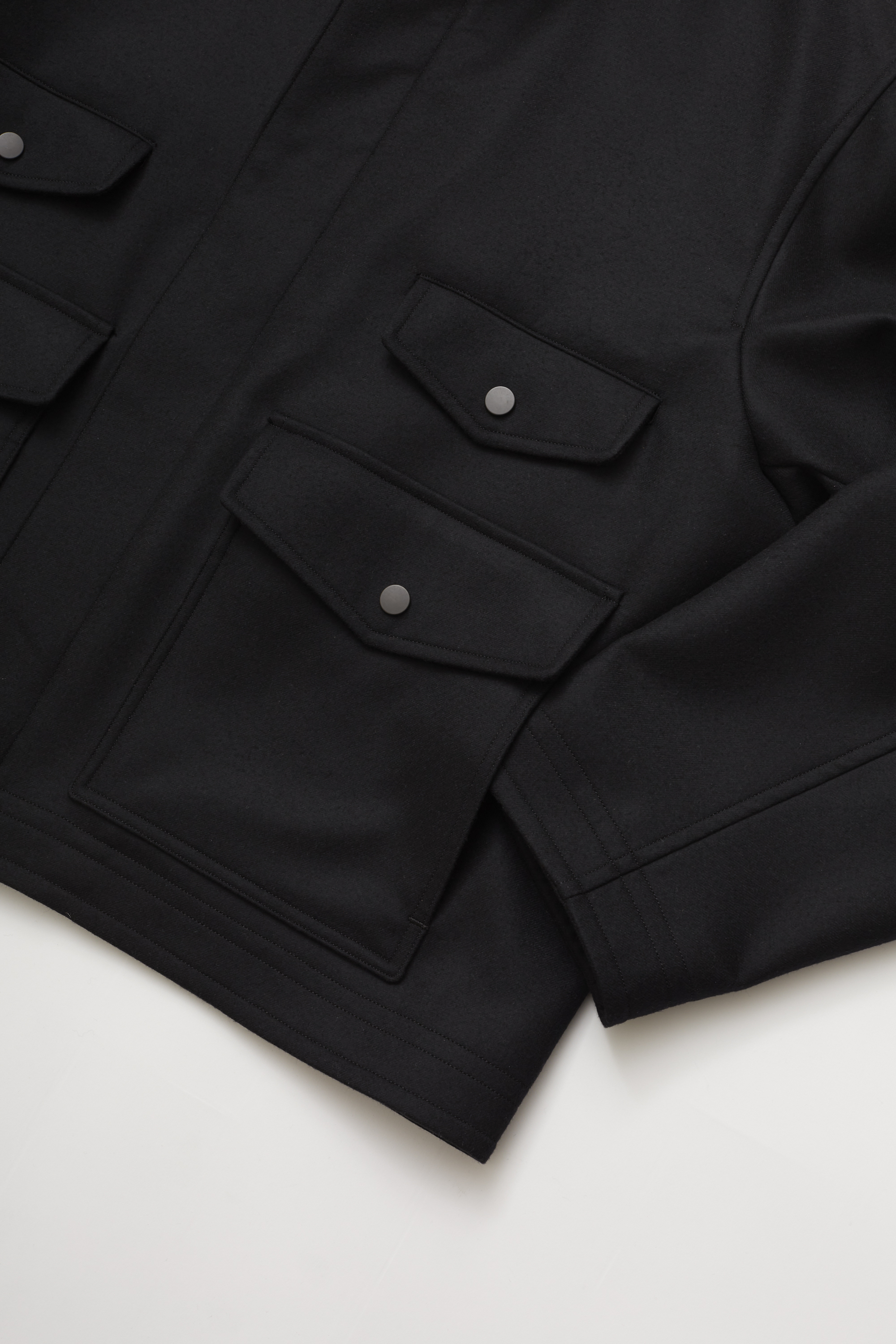 · 使用高級雙面織輕量縮絨呢料,Super130’s 梳毛羊毛。經過改良的織法與縮絨處理,使布料在保有挺度與結構感的同時,實現更輕更薄的穿著體驗