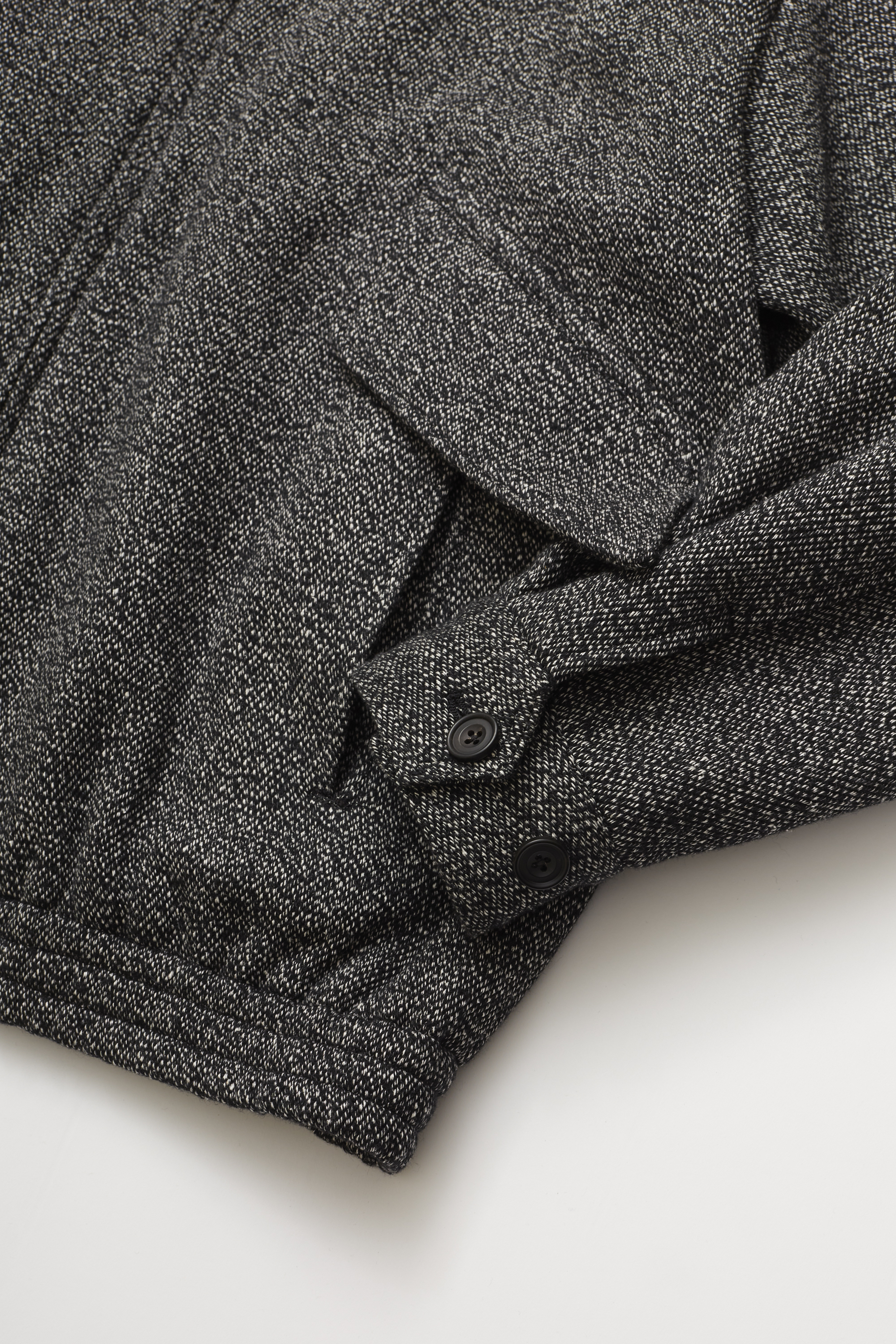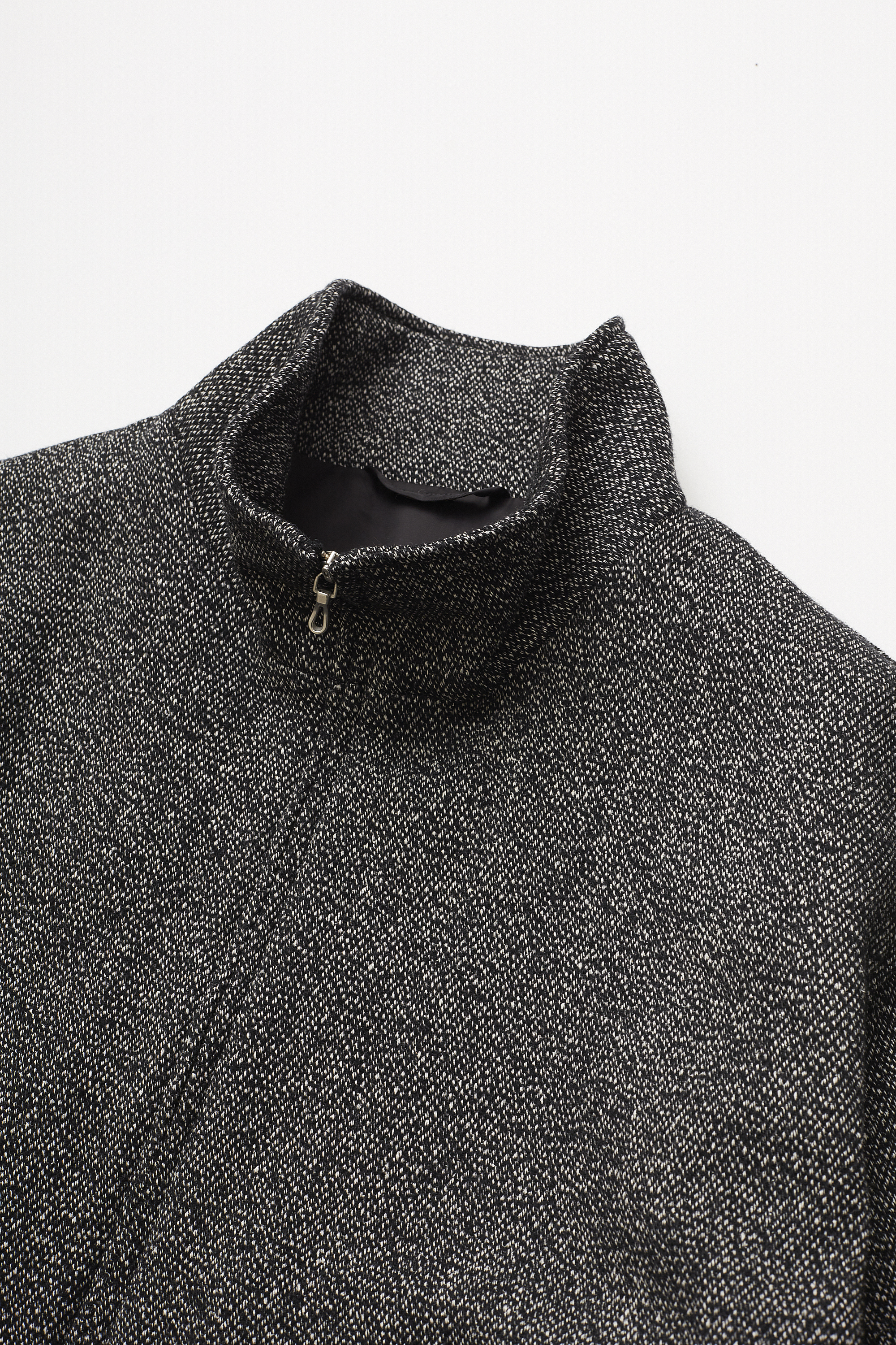 · 靈感源自 Vintage fabric,但在密度與後續加工上進行現代詮釋。面料成分使用 Mule 製成的輕量、高蓬鬆度羊毛原料,以及與羊毛混紡的霜降絲線,提升質感層次